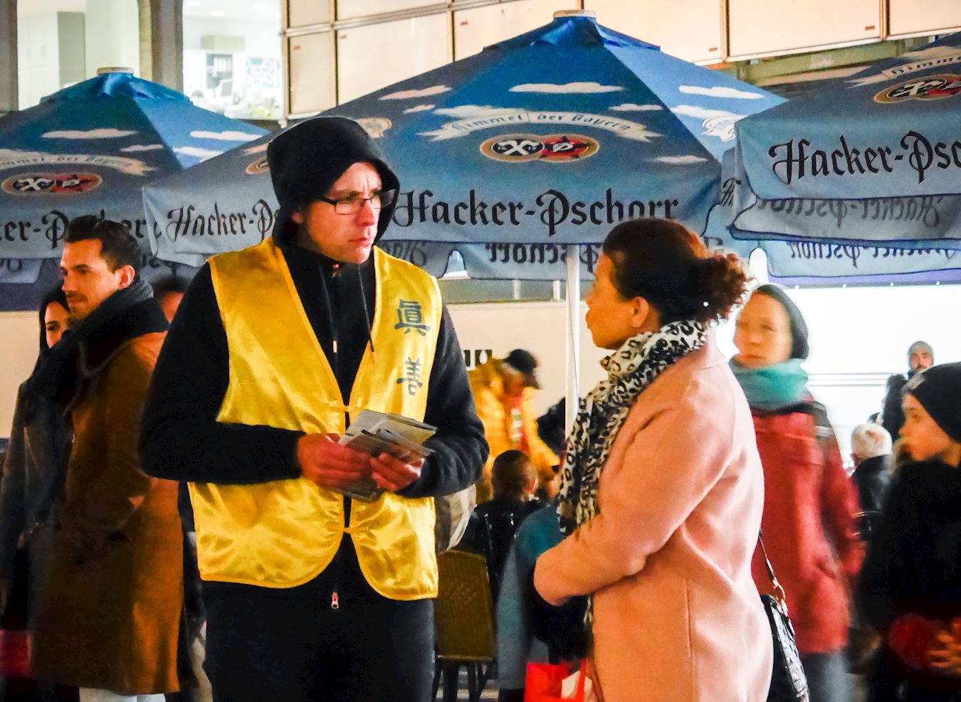 一位德国男士在活动现场感到很强的能量场,他对法轮功学员说:“你们为受害者伸张正义做得很好!按照真善忍的原则生活太好了!”