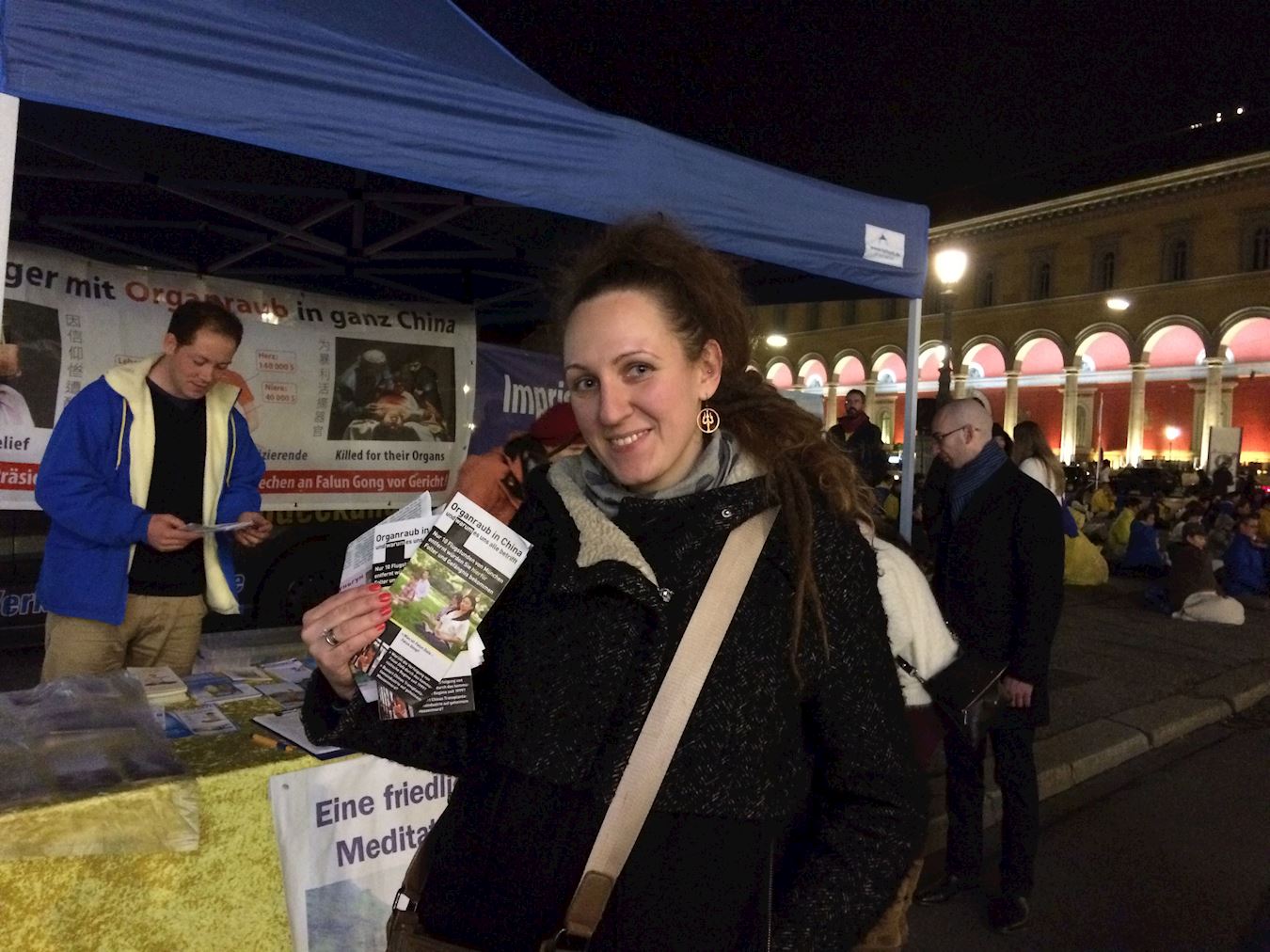 慕尼黑的出版商安娜(Anna)路过广场,看到法轮功学员举行的烛光守夜活动。她在支持法轮功学员反迫害征签表上签了名,然后坐在广场旁认真的阅读真相资料。安娜说她很高兴看到法轮功学员在慕尼黑举行活动,让更多的人知道在中国发生着什么,她自己也会告诉家人和朋友中共的暴行和法轮功遭受的非人迫害。