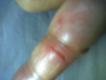 那时,我根本看不到他们谁在干什么,听到居委会的陈女士说:“还是不要把她弄坏了的好。”接着他们用我家里盘里的水果刀(我准备给他们削苹果用的),割伤了我的右手小指,只听副所长命令:“挤呀,使劲挤呀。”