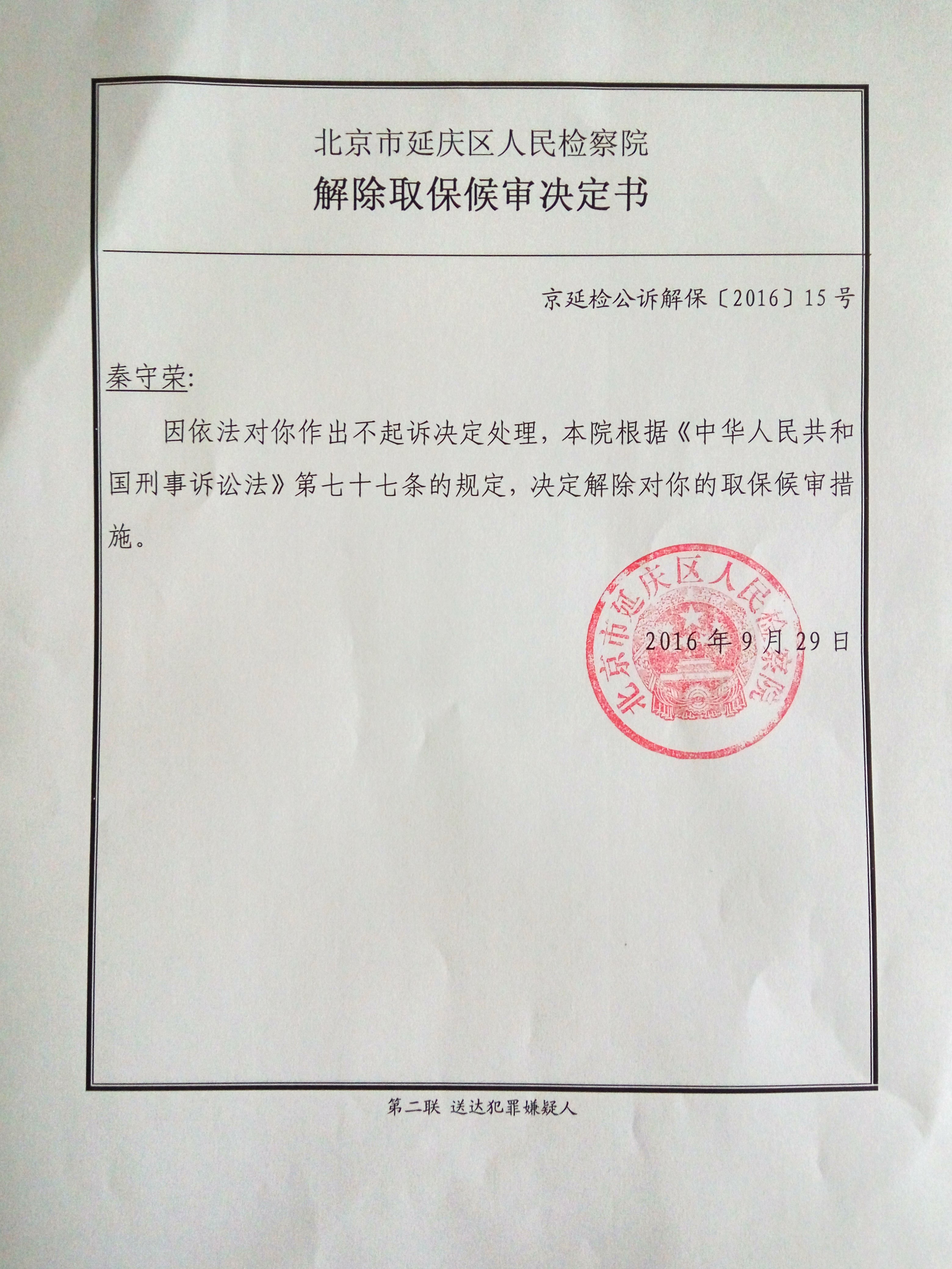 二零一六年九月二十九日,北京市延庆区检察院对法轮功学员秦守荣做出不予起诉的决定,同时根据《刑事诉讼法》第七十七条的规定解除对她的取保候审的决定。秦守荣从检察院取回两个法律文件“京延检公诉邢不诉【2016】16号”与“京延检公诉解保【2016】16号”。