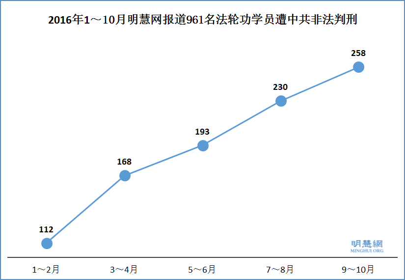 二零一六年九至十月份明慧网报道的被中共非法判刑的法轮功学员共258人,从二零一六年一月至十月,明慧网报道的被中共判刑迫害的法轮功学员累计961人。从下面的统计图可以看出,中共打着法律的幌子对修炼真善忍的法轮功学员的迫害在今年呈上升趋势,由一~二月的112人被诬判,增至九~十月的258人。
