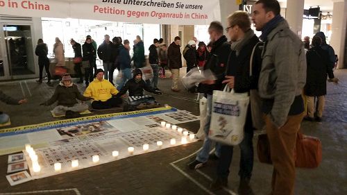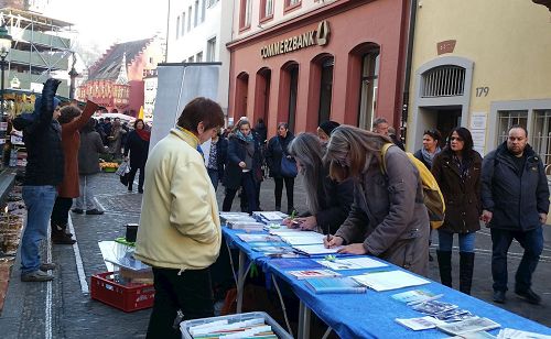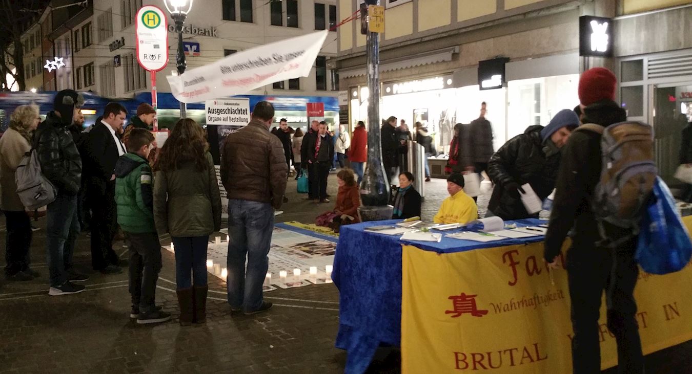 今年的国际人权日恰逢周六,正是人们逛街购买圣诞礼物的高峰期。当日弗莱堡的大街小巷,游人如织。白天,露天圣诞市场最热闹,法轮功真相信息台设在了圣诞市场的出入路口。晚上,在繁华商业街的十字路口,法轮功学员们还举办了烛光守夜,悼念被中共迫害死的法轮功学员。