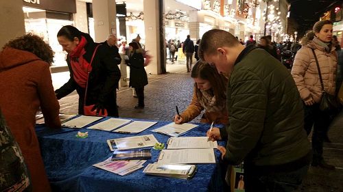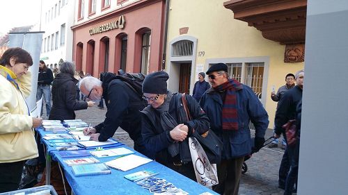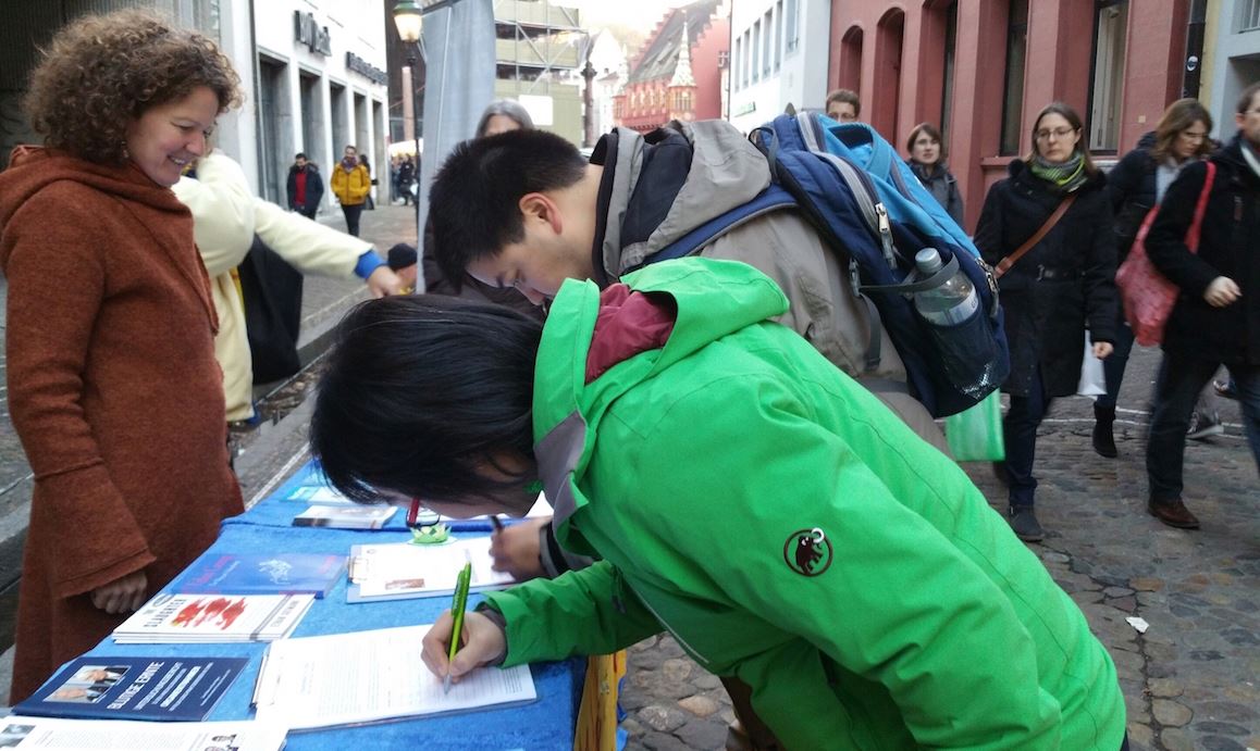 一位来自科隆的德国先生说,他在科隆经常看到法轮功学员炼功,但是不知道活摘器官的事。他说现在世界到处都发生着很糟糕的事,德国也有,但是中共活摘器官的事情要糟糕得多!他签名后说:希望你们坚持下去,希望签名能对这件事有所推动。