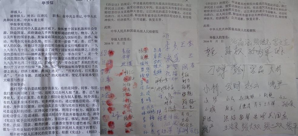 还有的人说:“早就应该控告他(江泽民),要不他哪能逞凶这么多年。善良人遭受了这么多年的苦难,多少人被他害得家破人亡,妻离子散。我支持你们,我签名控告他。”