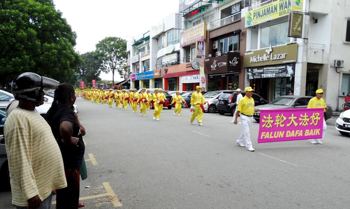 中午十二时许,部份法轮功学员来到巴生武吉丁宜商业区(Bukit Tinggi)游行。天国乐团、仙女队、舞龙队、腰鼓队,还有祥和的法轮功功法示范队伍,在自愿警卫队协助开路下浩荡出发,许多民众喜见法轮功游行,更有民众为法轮功送上祝福。