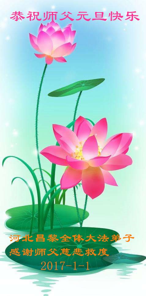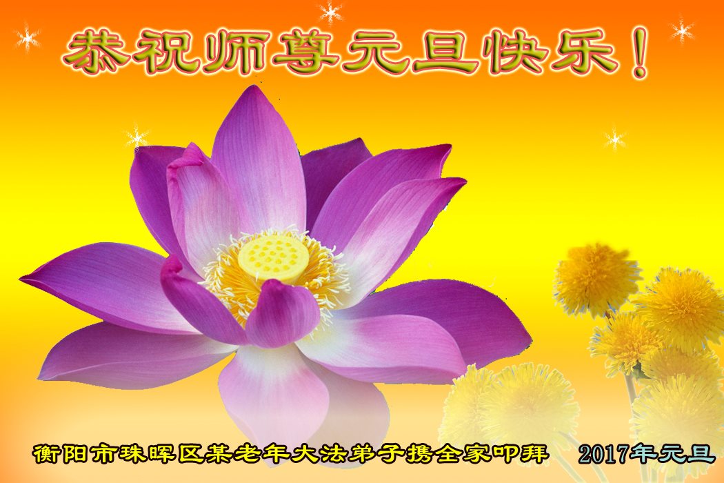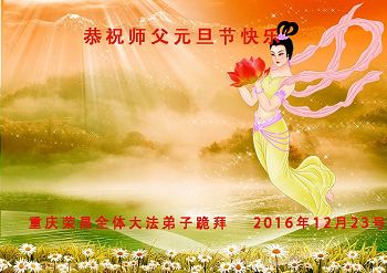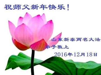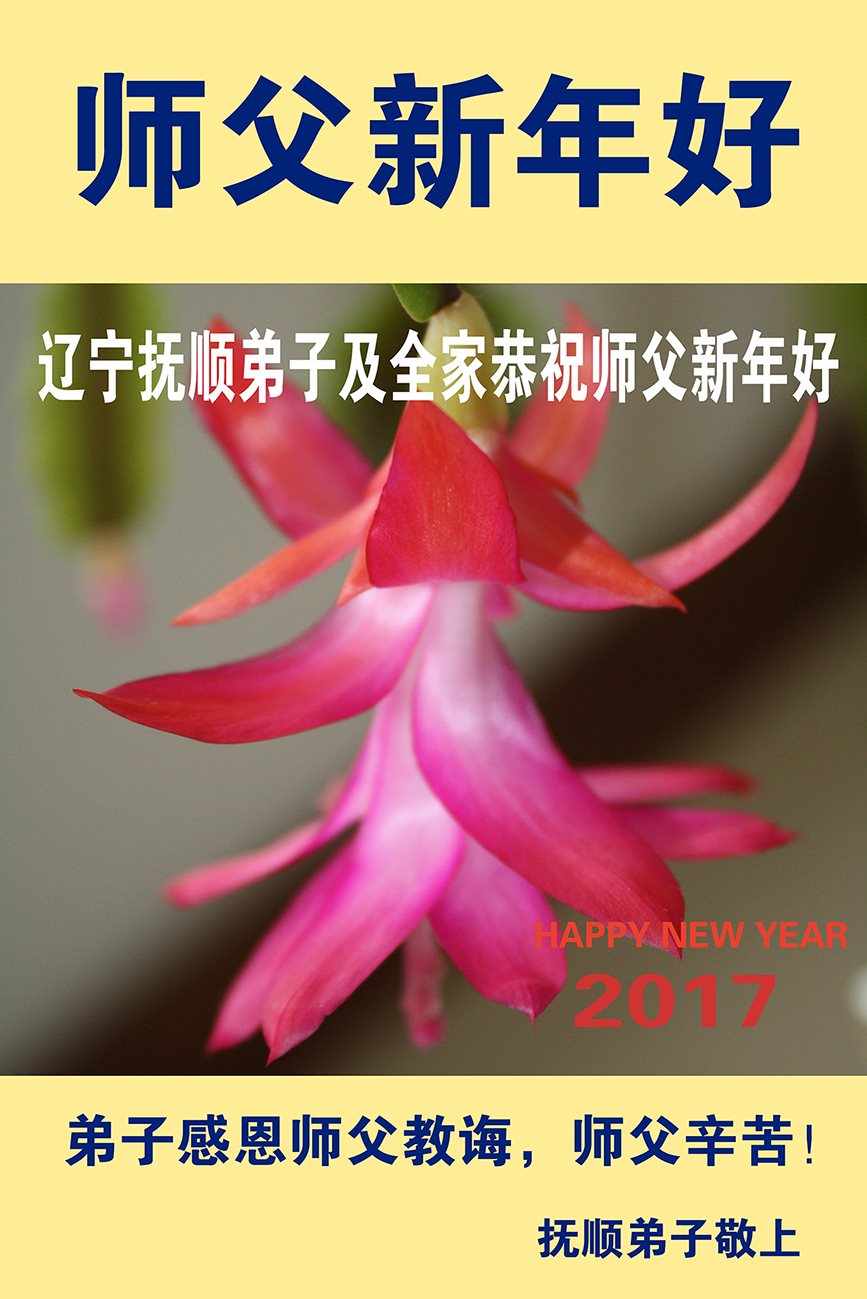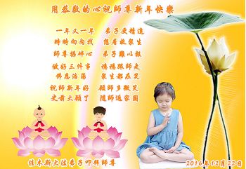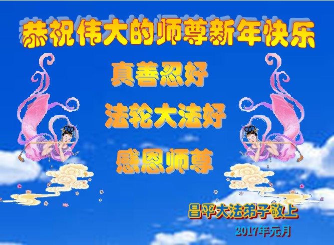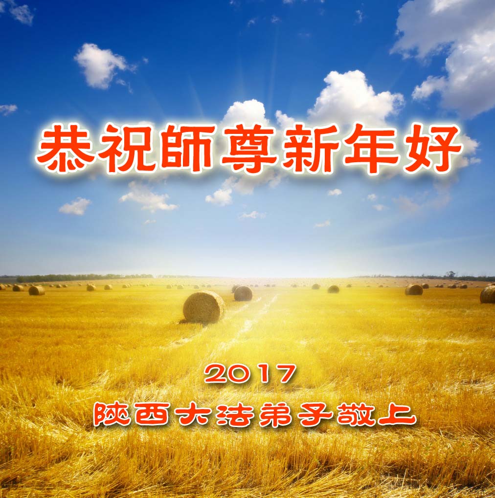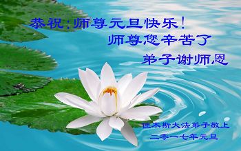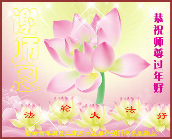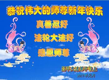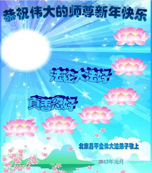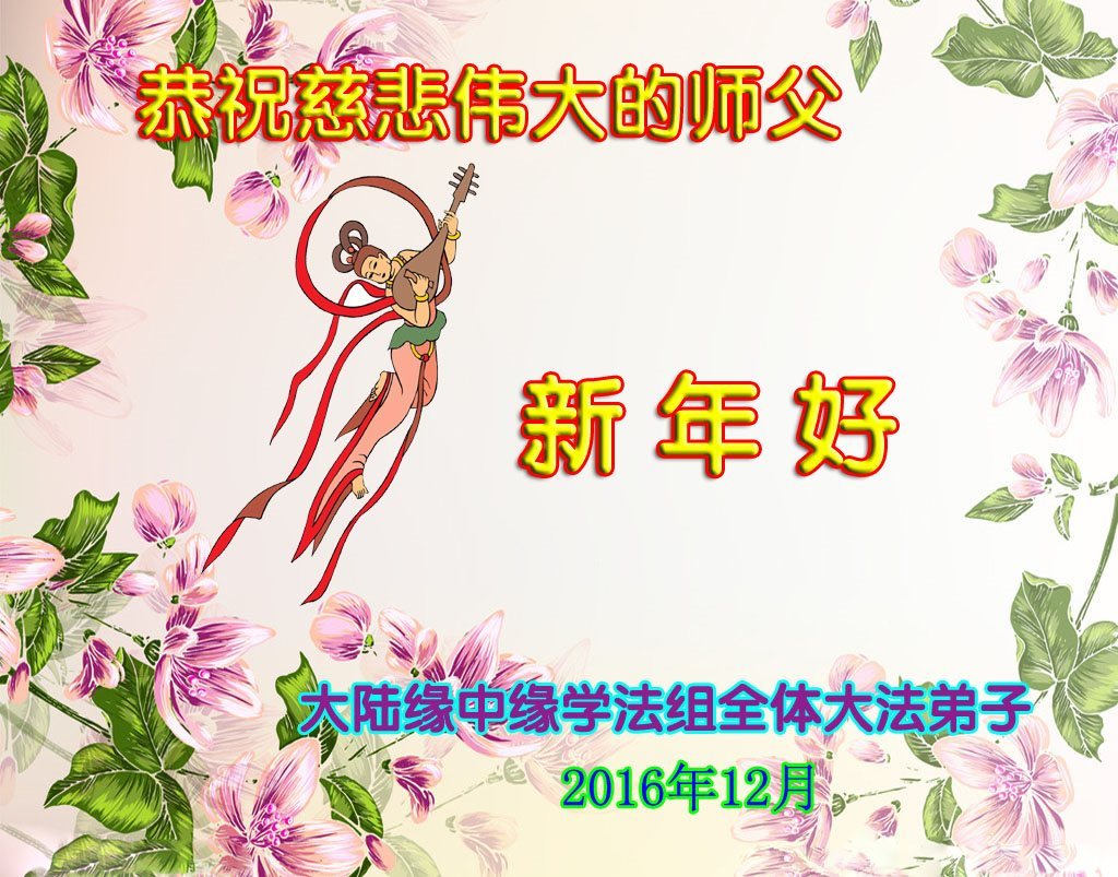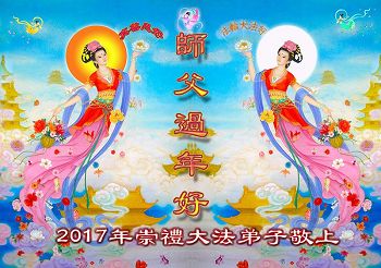 二零一七年即将来临,我向师尊问好!师尊辛苦了!我怀着无限崇敬的心情感恩师尊的苦度!中共邪党对修真、善、忍的法轮功学员实施了最严酷的史无前例的迫害。在迫害中我没有倒下。我在伟大慈悲师尊时时刻刻的呵护下,在风风雨雨中我已修炼了二十年了,我在兑现着正法时期大法弟子救度众生的誓约。在修炼过程中还有许多为名、利、情产生的人的心。请师尊放心,弟子听您的话,走您安排的路,多学法,学好法,遇事向内找,修好自己,做好大法弟子必须做的三件事。弟子盼望师尊早日回中国大陆!盼望神韵早日来中国大陆演出!
