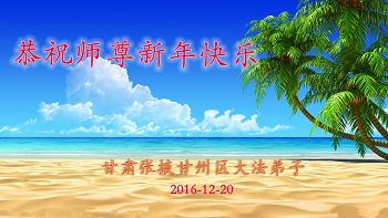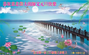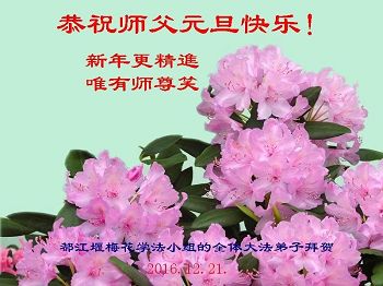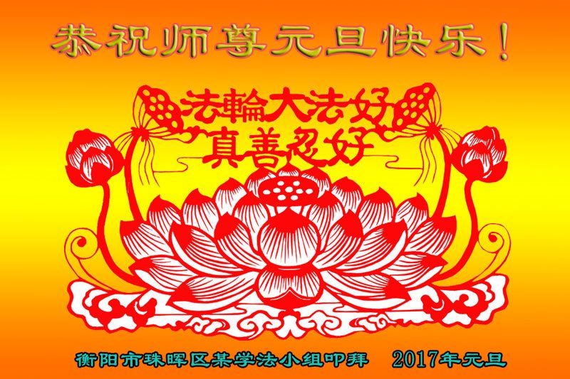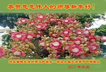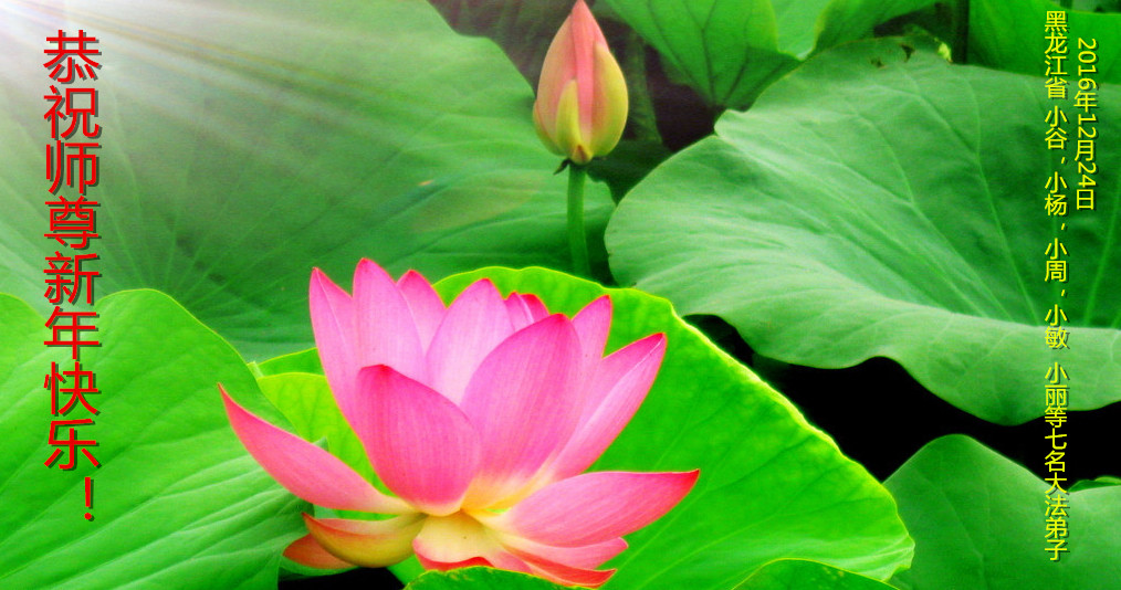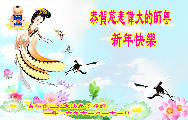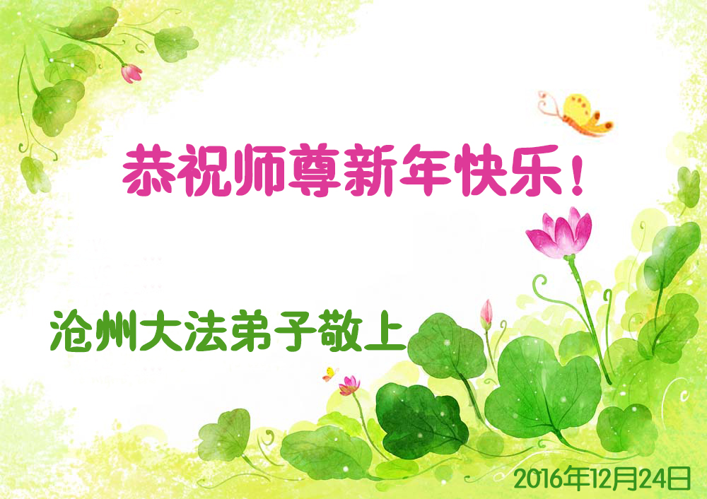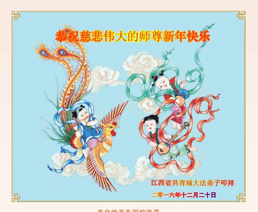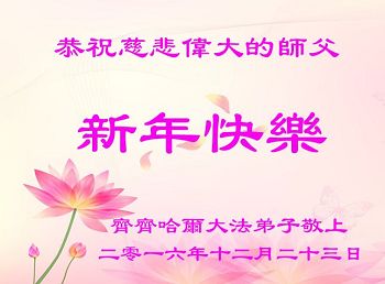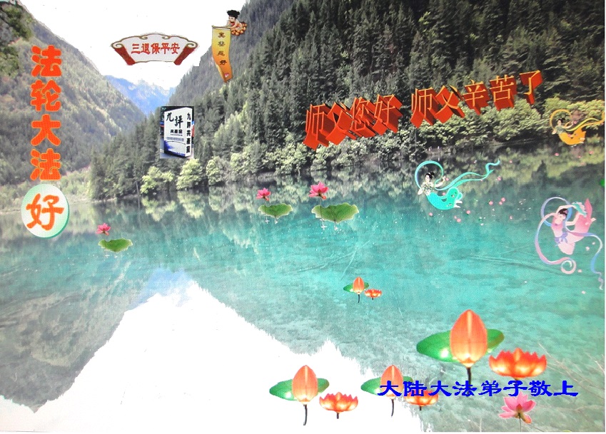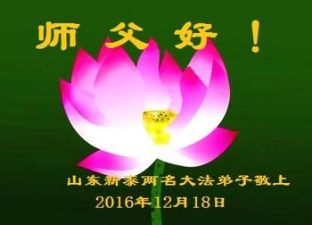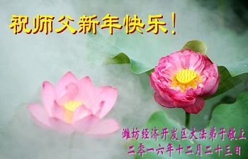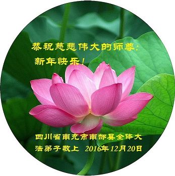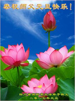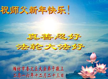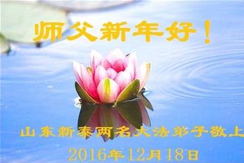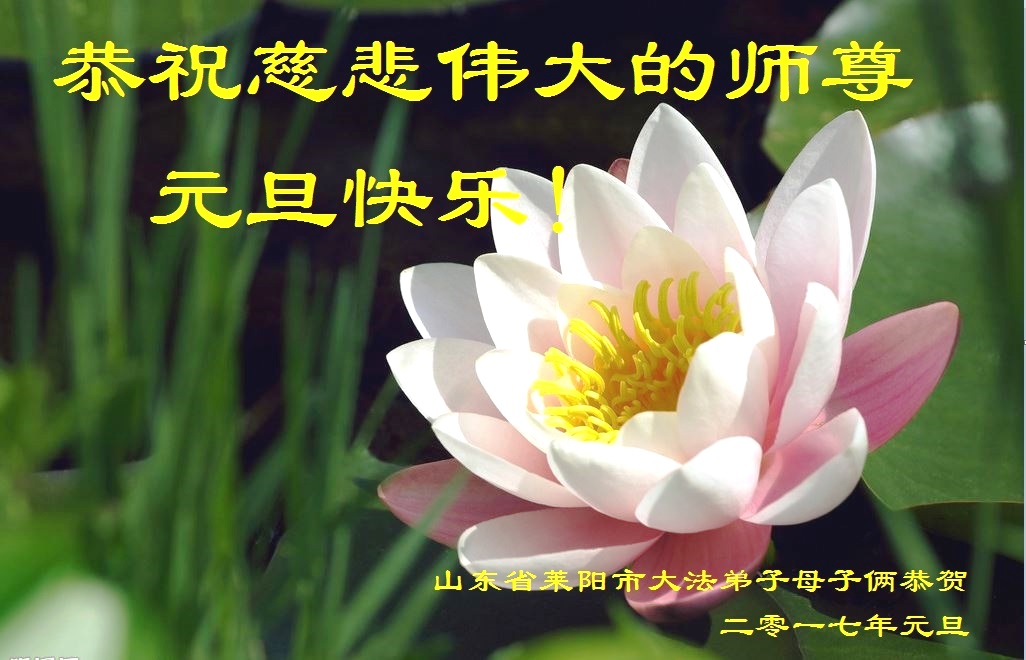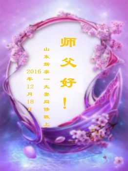 二零一七年即将来临,我向师尊问好!师尊辛苦了!我怀着无限崇敬的心情感恩师尊的苦度!中共邪党对修真、善、忍的法轮功学员实施了最严酷的史无前例的迫害。在迫害中我没有倒下。我在伟大慈悲师尊时时刻刻的呵护下,在风风雨雨中我已修炼了二十年了,我在兑现着正法时期大法弟子救度众生的誓约。在修炼过程中还有许多为名、利、情产生的人的心。请师尊放心,弟子听您的话,走您安排的路,多学法,学好法,遇事向内找,修好自己,做好大法弟子必须做的三件事。弟子盼望师尊早日回中国大陆!盼望神韵早日来中国大陆演出!