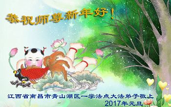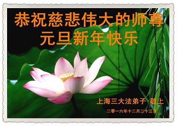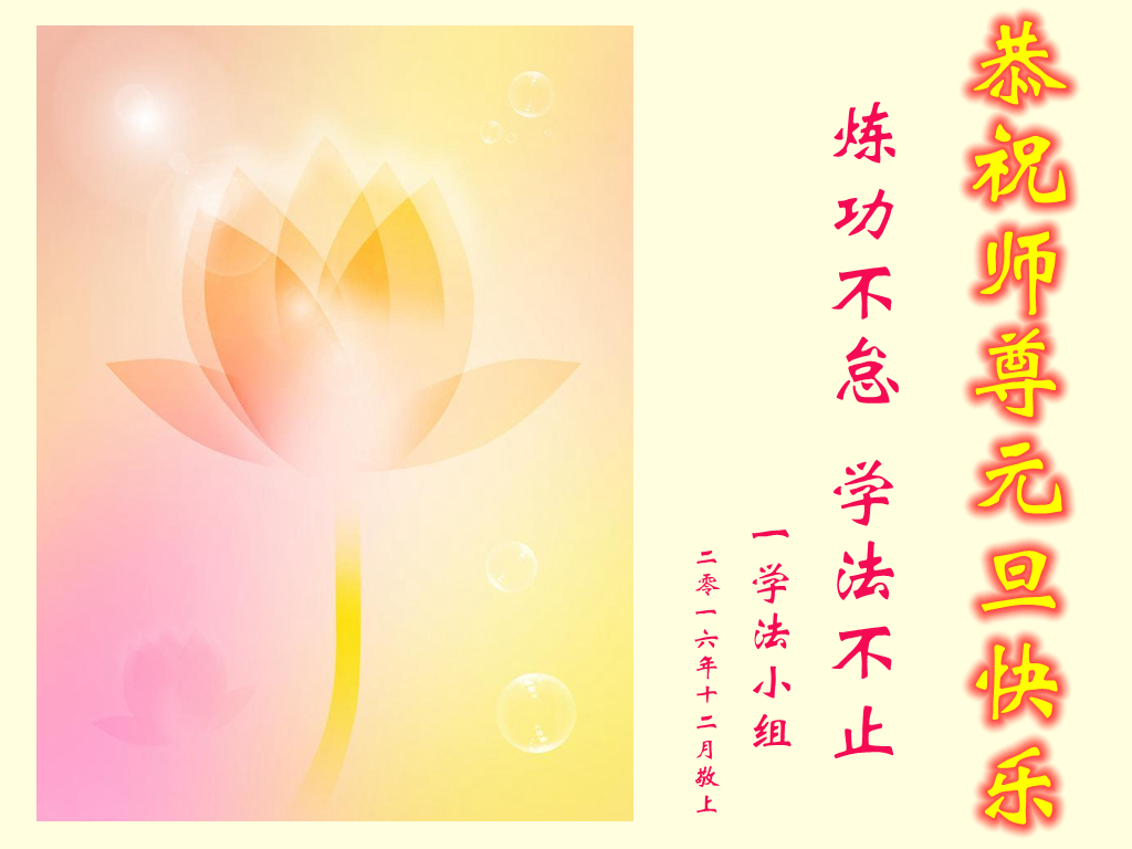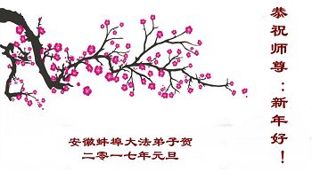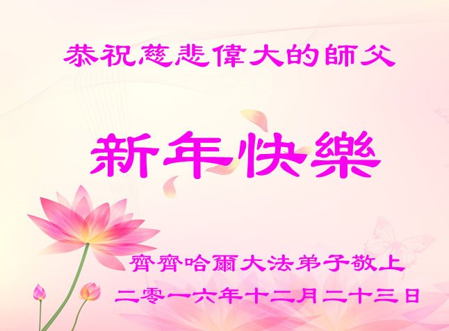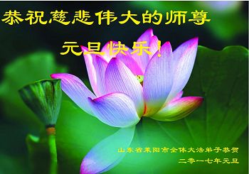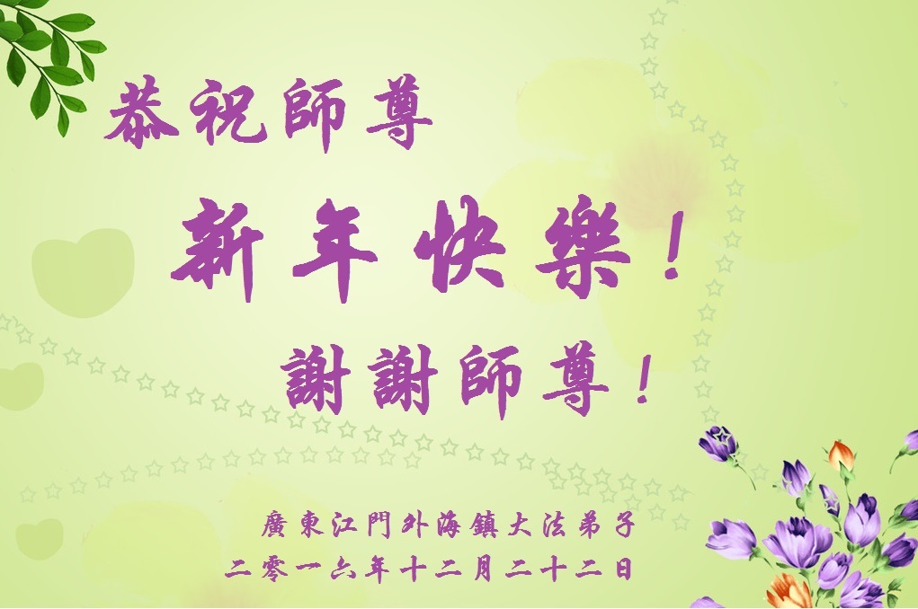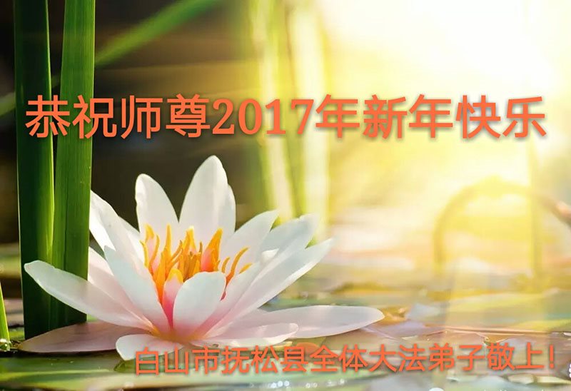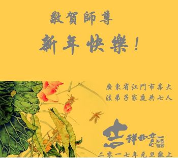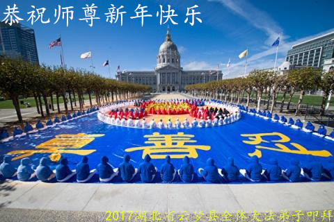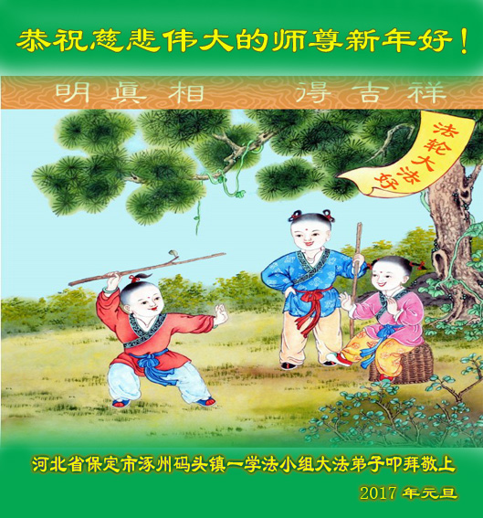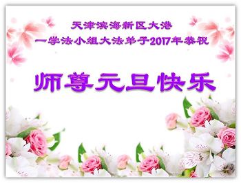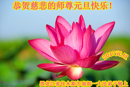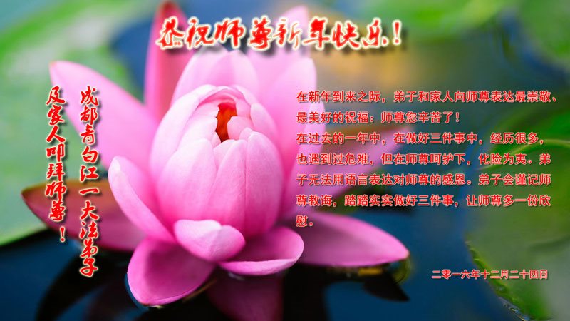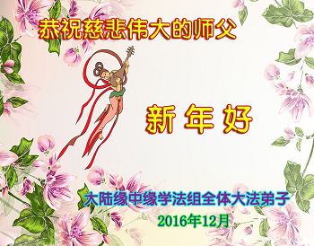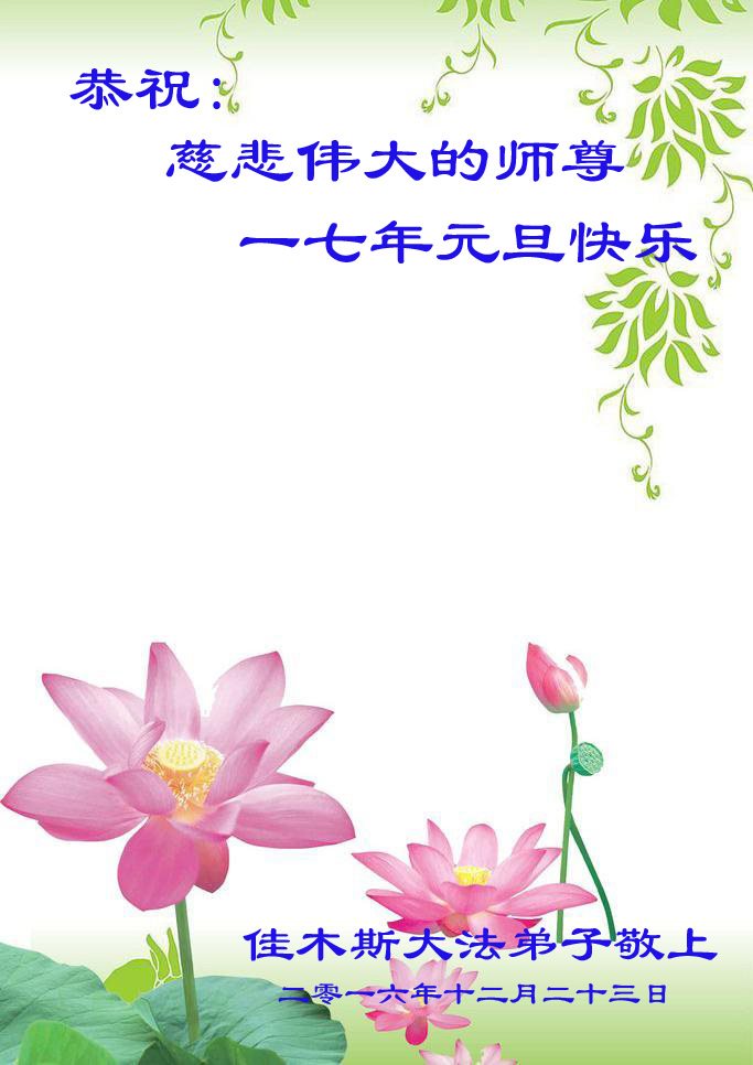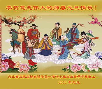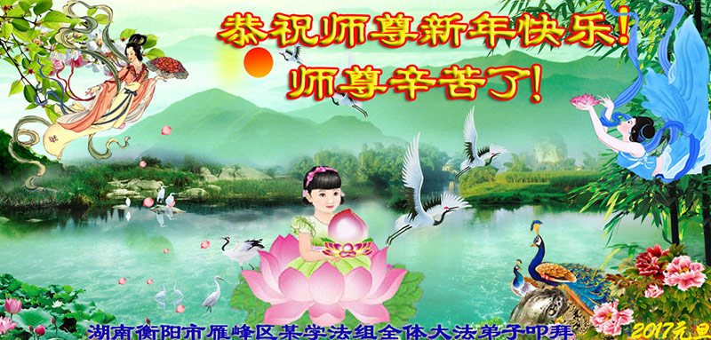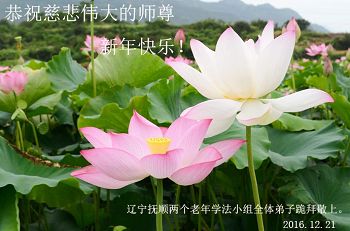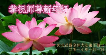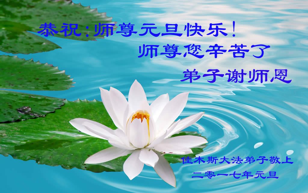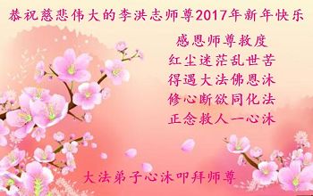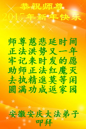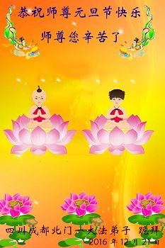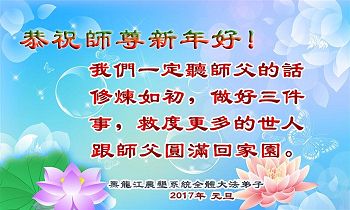 在二零一七年新年即将到来之际,我们怀着无限感恩的心情,向慈悲伟大的师尊致以新年的问候!师尊您好!师尊辛苦了!在新的一年里,在师尊以巨大的承受换来的宝贵时间里,弟子们决心多学法,静心学法,读懂法,用法来归正自己的一思一念、一言一行,时时事事向内找,去掉还未修去的人心、观念、执着,脚踏实地、踏踏实实做好三件事,多救世人,兑现自己的誓约,跟师父回家。叩拜师父!