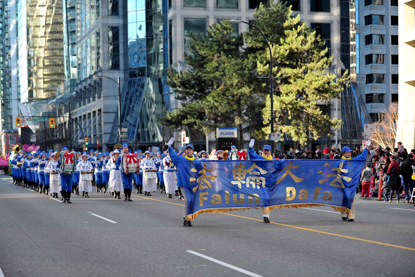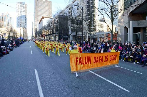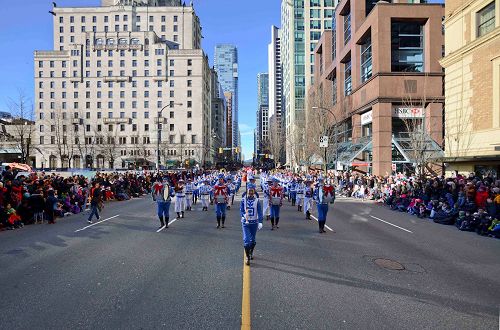一年一度的圣诞大游行是温哥华规模最大的游行之一,今年有四十六个团体参加,市中心道路两旁摩肩接踵挤满了观看游行的民众,据主办方数据每年约有二十万观看。温哥华法轮功学员们的游行方阵包括:天国乐团,真善忍大法花车,法轮功功法演示队,舞蹈队和腰鼓队。阵容庞大的法轮大法学员的游行队伍引来道路两旁观众们的阵阵欢呼。