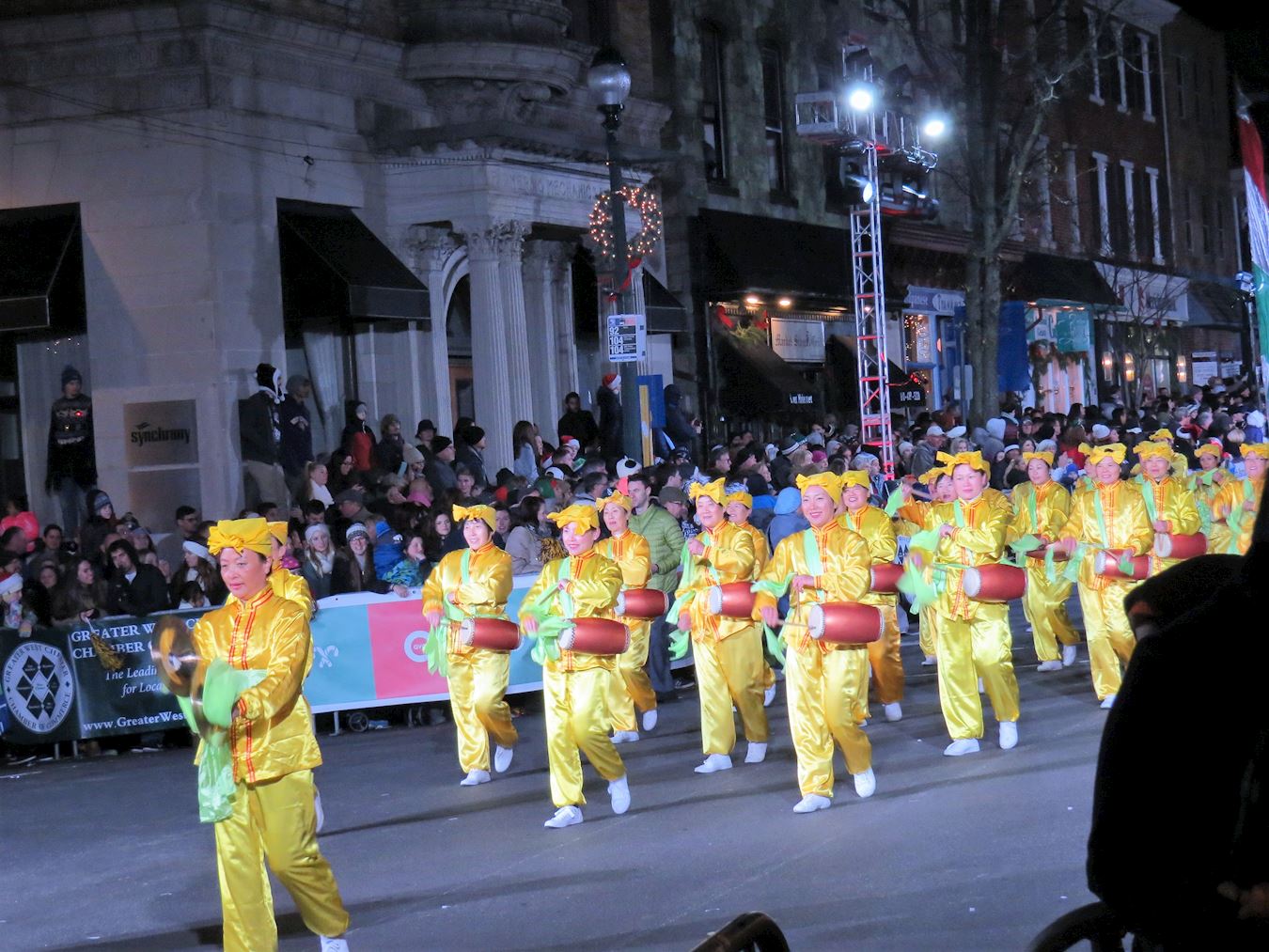 ![]() 图:由费城及周边城市的部份法轮功学员组成的腰鼓队应邀参加在西切斯特市(West Chester)圣诞游行,这已是法轮功学员连续第九年受到邀请 |