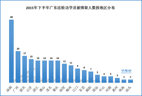 据明慧网报道出来的消息,2015年下半年广东省内被绑架的法轮功学员215人,多数是诉江的法轮功学员,受到非法行政拘留5~15天。