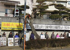 大年除夕全球迎接过年之际,日本熊本地区的法轮功学员在九州岛地区的中领馆前举行反迫害活动,抗议中共对法轮功长达十六年的血腥迫害。