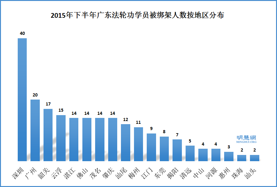 【明慧网二零一六年二月十一日】(明慧网通讯员广东报道)据明慧网报道出来的消息,2015年下半年广东省内被绑架的法轮功学员215人,这些被绑架者多数是诉江的法轮功学员,受到非法行政拘留5~15天。从整体情况来看,迫害是强弩之末,越来越难以为继。