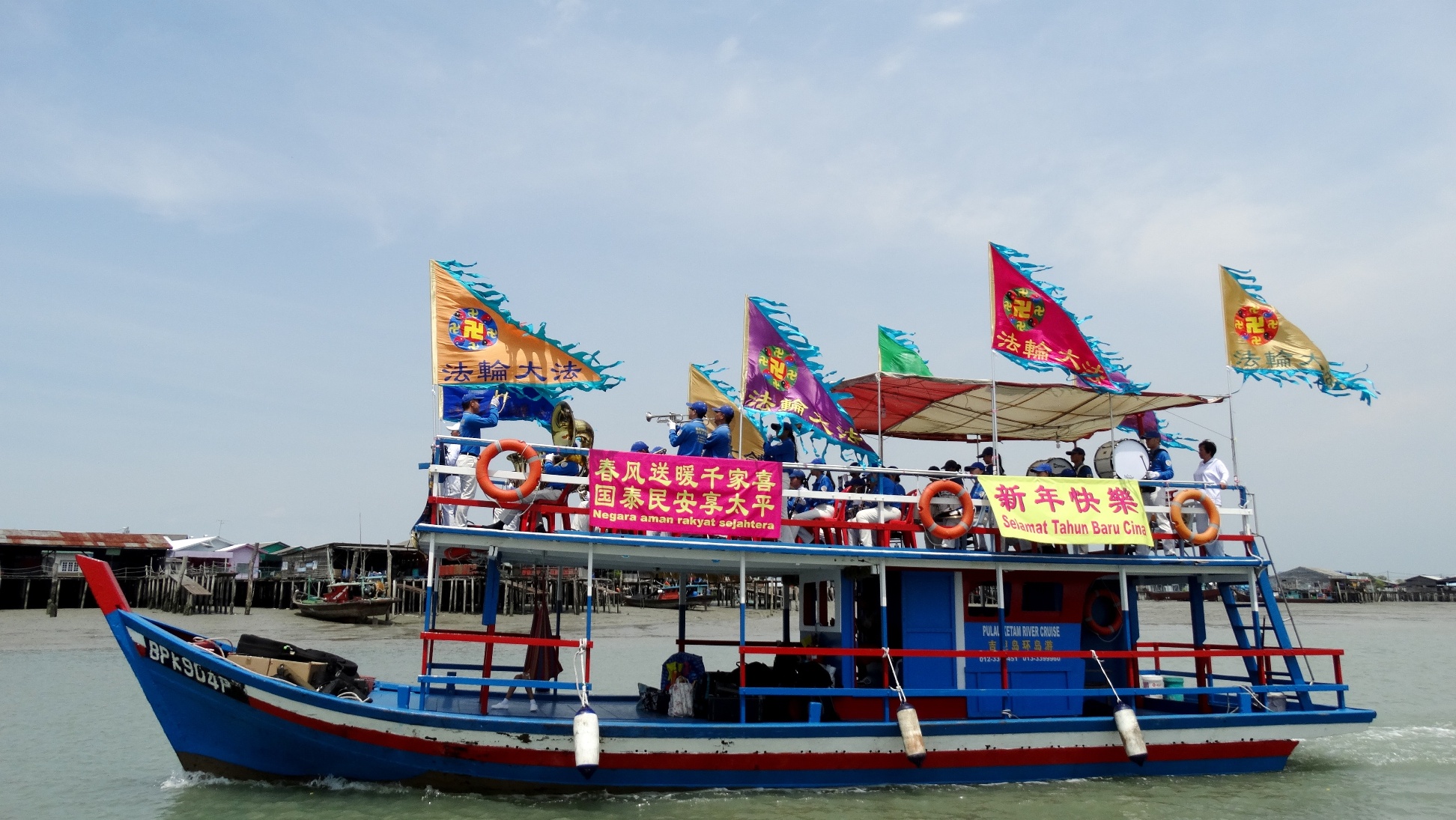 二月十三日下午一时,天国乐团团员乘上一艘主要以七彩缤纷的“法轮大法”旗子装饰的双层吉胆岛(Pulau Ketam)环岛游船,开始了当天的环岛演奏。在历时约一小时半的行程中,天国乐团环绕了吉胆岛沿岸两个人口密集的主要渔村,吉胆渔村和五条港渔村,向民众送上新年祝福。天国乐团演奏着一首接一首震撼人心、优美的乐曲,嘹亮的旋律传遍了吉胆岛的多个角落,增添了当地新年喜庆气氛。