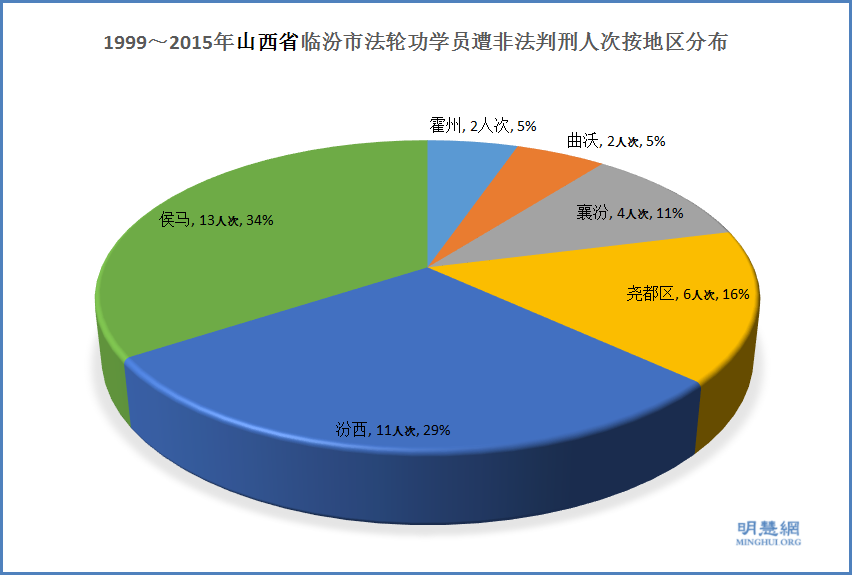1999~2015年山西省临汾市法轮功学员遭非法判刑人次按地区分布