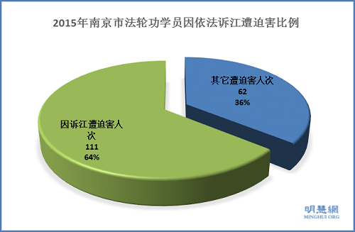 南京市法轮功学员二零一五年被绑架、抄家、骚扰173人次。据明慧网报道,南京市约七百名法轮功学员控告迫害元凶江泽民,至少111人因此遭绑架、抄家、恐吓、骚扰等迫害,实际被迫害数字远不止这些。