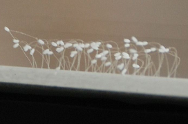 二零零八年十一月,我家的窗户玻璃上和塑钢窗户框上开了两簇优昙婆罗花,佛经上记载优昙婆罗花三千年一现,花开之时是转轮圣王下世传法之时。以前只是在网上看到过优昙婆罗花,现在却盛开在我家里,我的心情真是太激动了(见下图)。