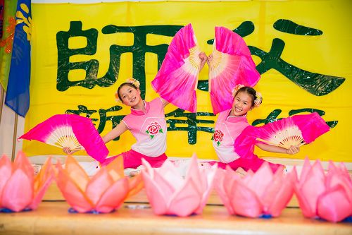 在金黄色莲花的环绕下,“师父新年好”的巨型条幅展示在会场中央,各族裔的法轮功学员,男女老少双手合十,感恩李洪志大师的慈悲苦度,并恭祝李洪志大师新年好,他们以最虔敬和感恩的心连声祝颂“师父新年好!法轮大法好!”