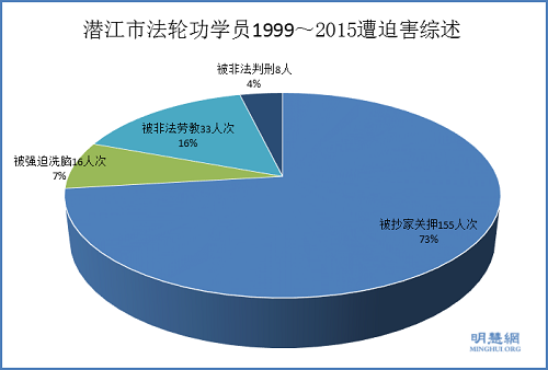 据不完全统计,从一九九九年至今,先后有155人次被非法抄家关押,16人次被强迫洗脑,33人次被非法劳教,8人被非法判刑。
