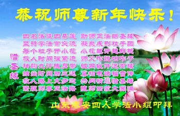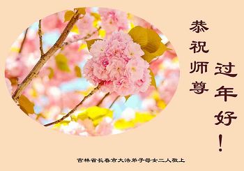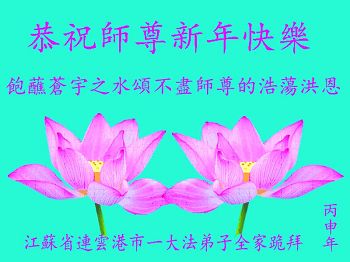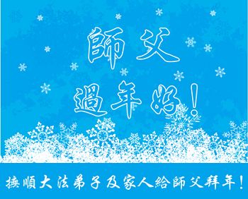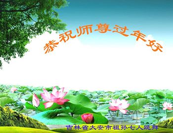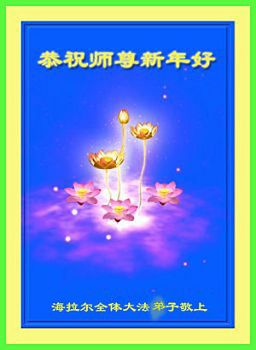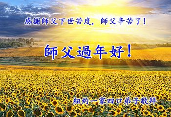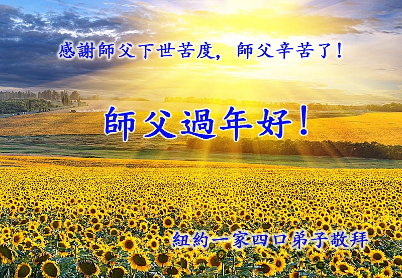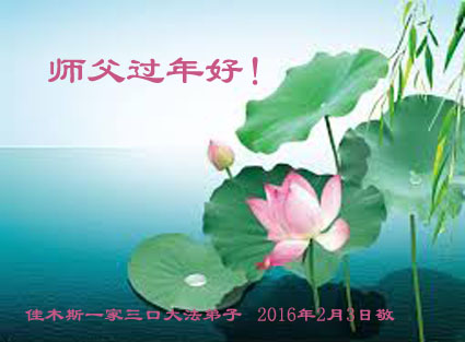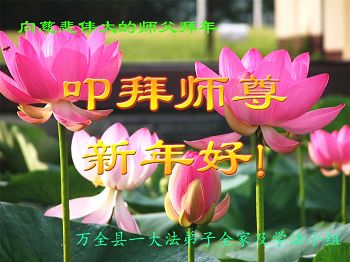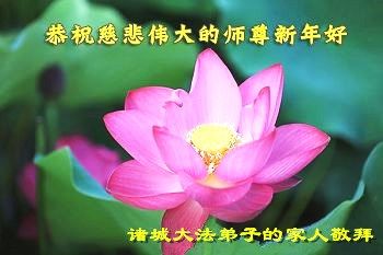 我们是明白真相的大法弟子的家人,虽然我们还没有真正走入修炼,但大法真、善、忍的精神早已经走入了我们心中,在认同支持大法弟子的同时,我们的身心都曾经受益匪浅!在新年来临之际,我们向伟大慈悲的大法师父真心的说一声:谢谢您!祝您新年快乐!早日回国!