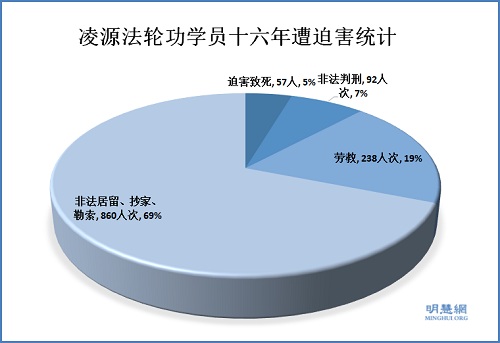 十六年来,凌源被迫害致死的法轮功学员57人,判刑92人次,劳教238人次,非法拘留、抄家、罚款勒索860人次,勒索钱财210多万元。