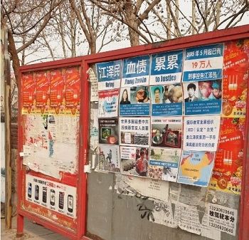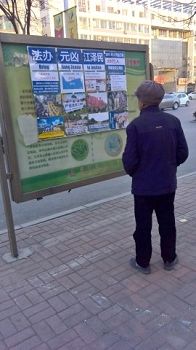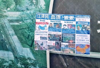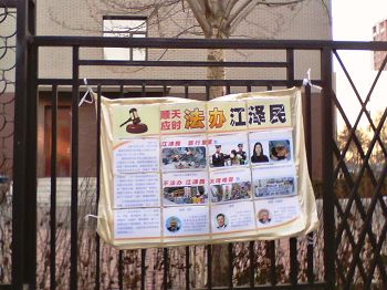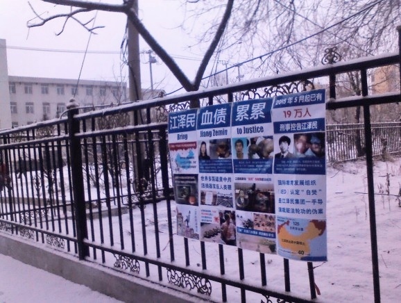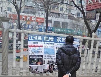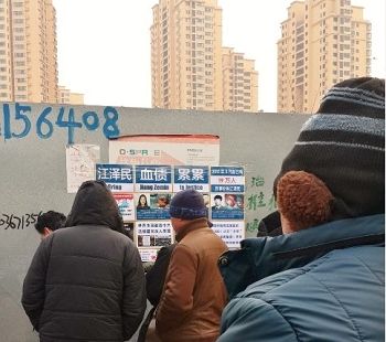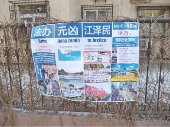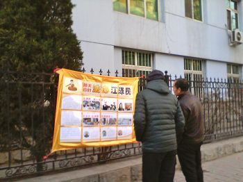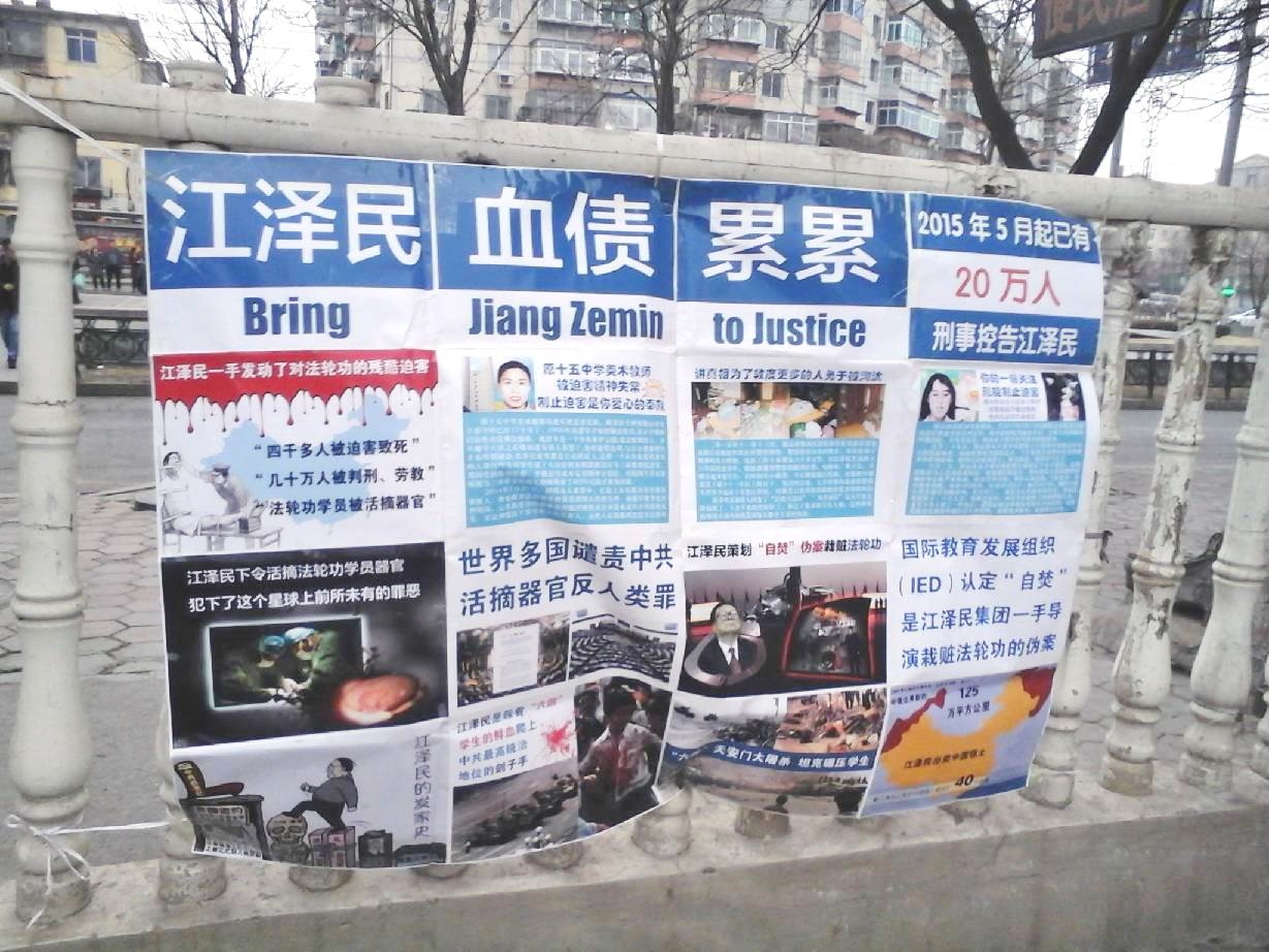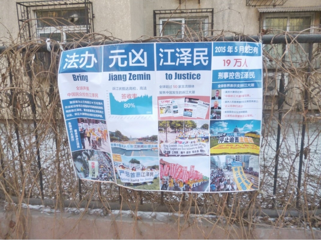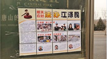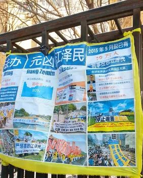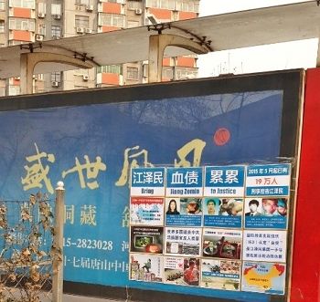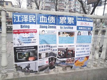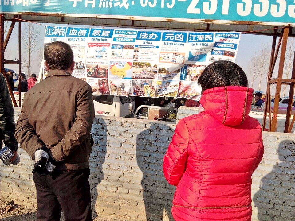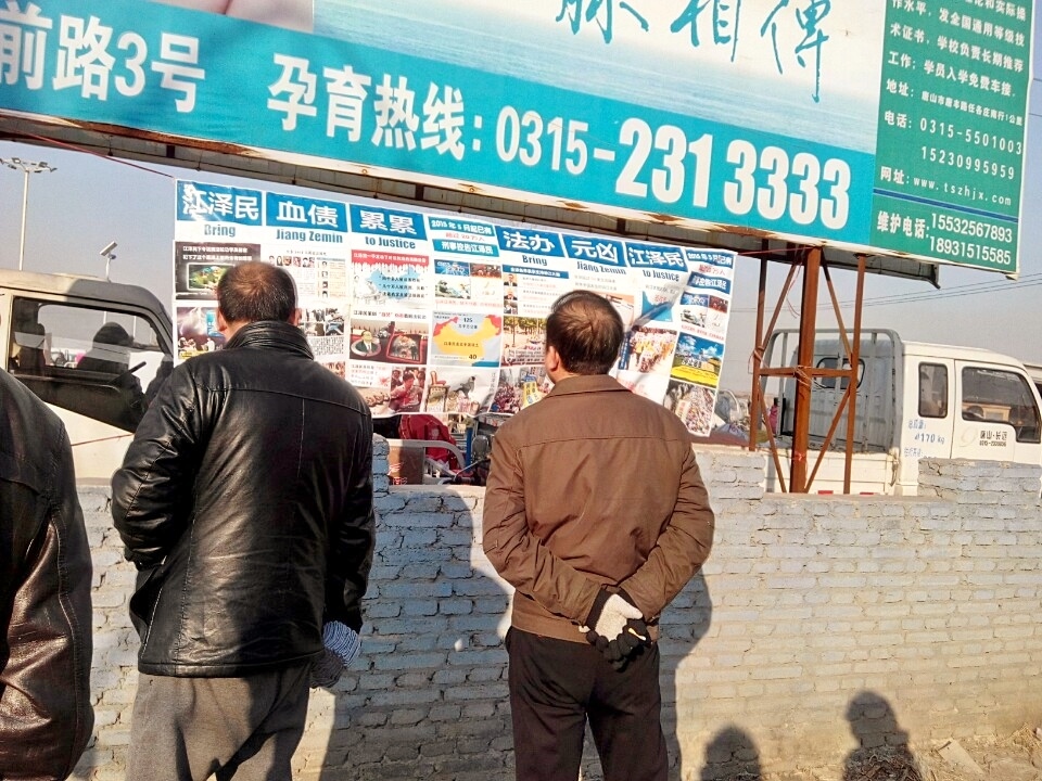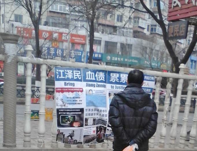 过年期间,河北唐山地区等地多处出现诉江展板,民众纷纷闱看 有的说:“这下真要抓老江了?”