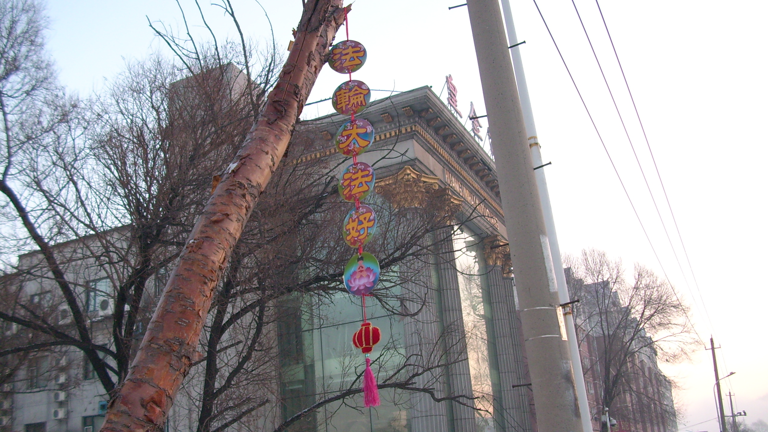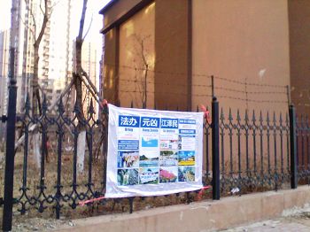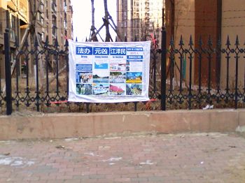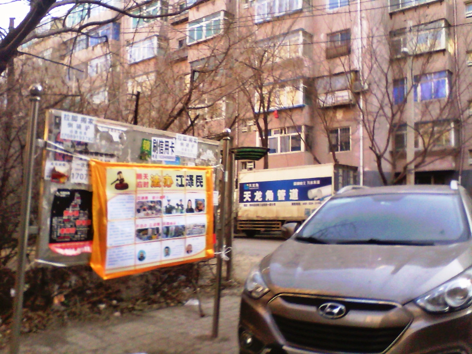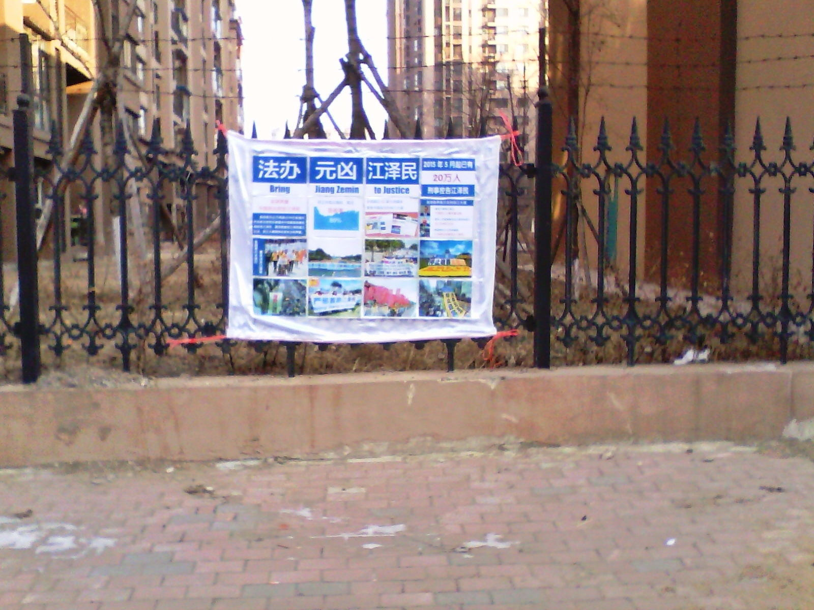 近日哈尔滨市街头巷尾、公园、路边出现了许多法轮功真相展板。在路边、公园、社区等大树上、高楼上、桥上悬挂着法办元凶江泽民,将江泽民绳之以法,停止对法轮功的迫害等条幅。前几天气温回升,多处可见江泽民罪行的不干胶。