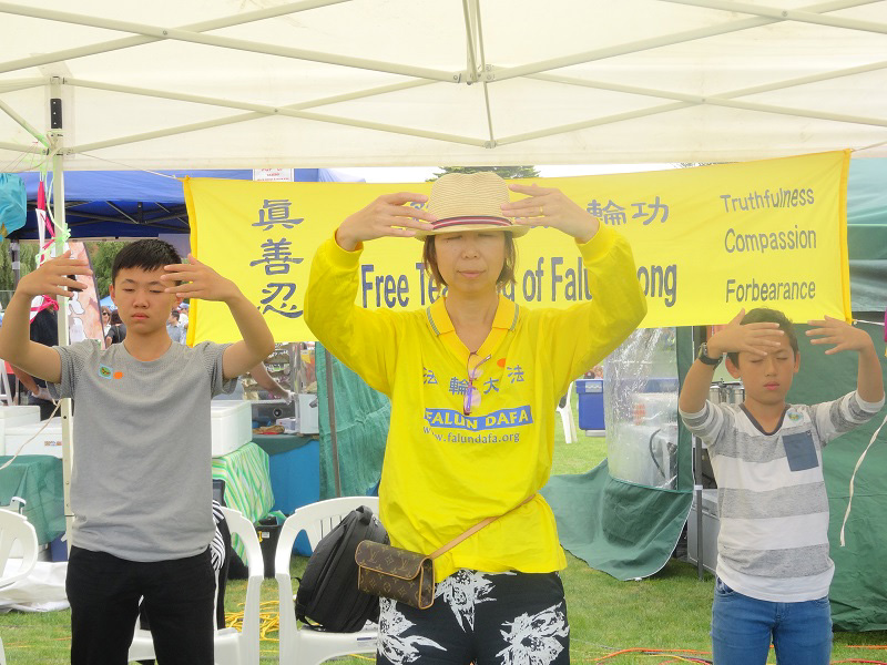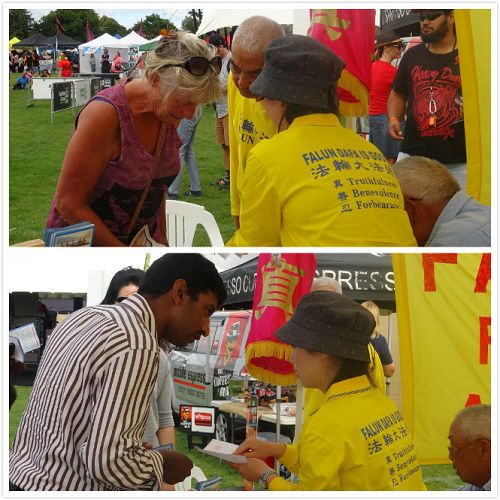 许多民众在法轮功学员的摊位前驻足观看。他们有的拍照留念;有的接过了学员制作的印有“法轮大法好”、“真、善、忍”字样的小莲花书签和中文名彩纸;有的希望通过学炼法轮功使身心更加健康平衡;有的与法轮功学员讨论中共对法轮功学员的迫害真相,对法轮功表示支持;有的当场就向法轮功学员学习法轮功功法;还有的表示回去会上网了解更多法轮功信息并阅读法轮功书籍。