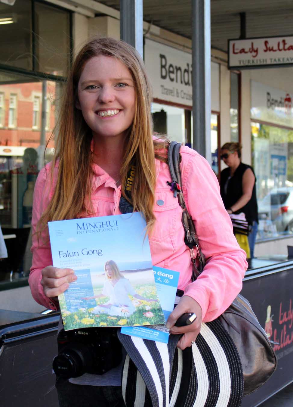 她拿出五倍邮寄她那张签了名给澳洲总理明信片价值的钱给法轮功学员安时说:“请帮我邮寄这张明信片,多余的钱帮其他人邮寄吧。我觉得这件事非常重要,我被你们做的事感动,希望我们大家都来支持停止对法轮功的残酷迫害。我会让我所有的朋友知道这事,并请我的亲朋好友都去看那还在澳洲电视台SBS Dateline网页上揭露中共非法活摘法轮功学员器官的纪录片《活摘》。”