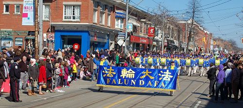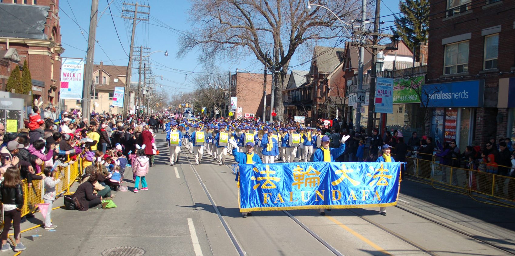 前一天还下着冰雨的多伦多,游行当天却阳光明媚,游行队伍从湖滨区的Munro Park(蒙罗公园)开始,沿着皇后街(Queen St.)一直到Woodbine Ave天国乐团队伍的横幅上的“法轮大法”在阳光照耀下金光闪闪,所到之处,人们都兴高采烈的欢呼,有的跟着音乐起舞,有的竖拇指,有的喊“欢迎法轮大法”。华人观众都举着手机或相机,在拍照或录像。有的表示看到这么壮观的法轮功队伍很自豪,有的表示录像留下历史的见证,有的感叹遇见法轮功真好。