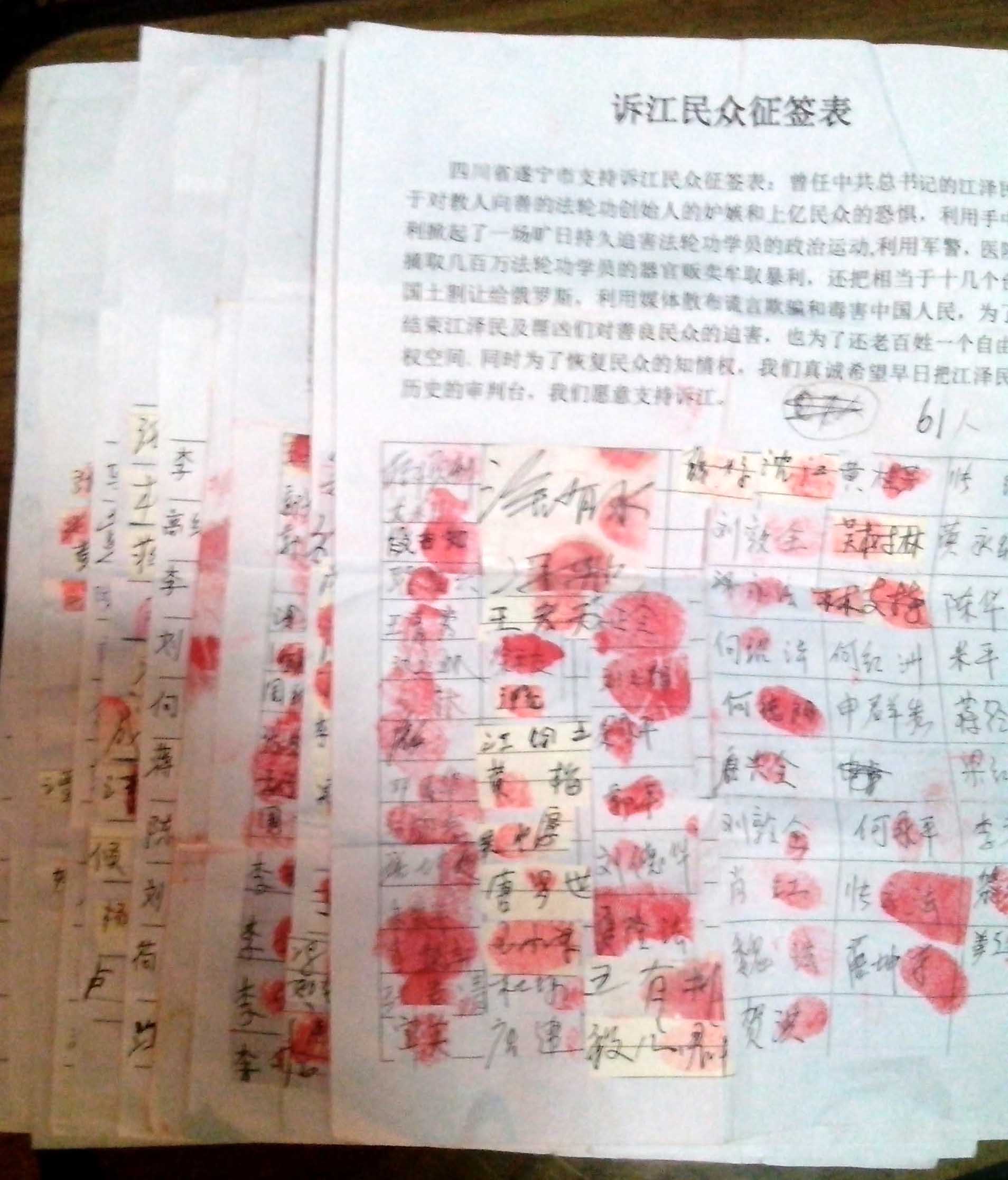 遂宁法轮功学员在讲真相、劝“三退”(退出中共及其附属的共青团、少先队)的同时,通过面对面、打电话、发资料、粘贴传单及挂展板等形式,向周围民众及各界人士讲述和传递大陆及全球民众控告江泽民的最新形势。世人听到法轮功学员堂堂正正控告江泽民的消息后,由开始的震惊,继而钦佩,发展到现在纷纷签名支持控告并参与举报江泽民,也有用真名、化名直接上最高检察院、法院网站举报的。