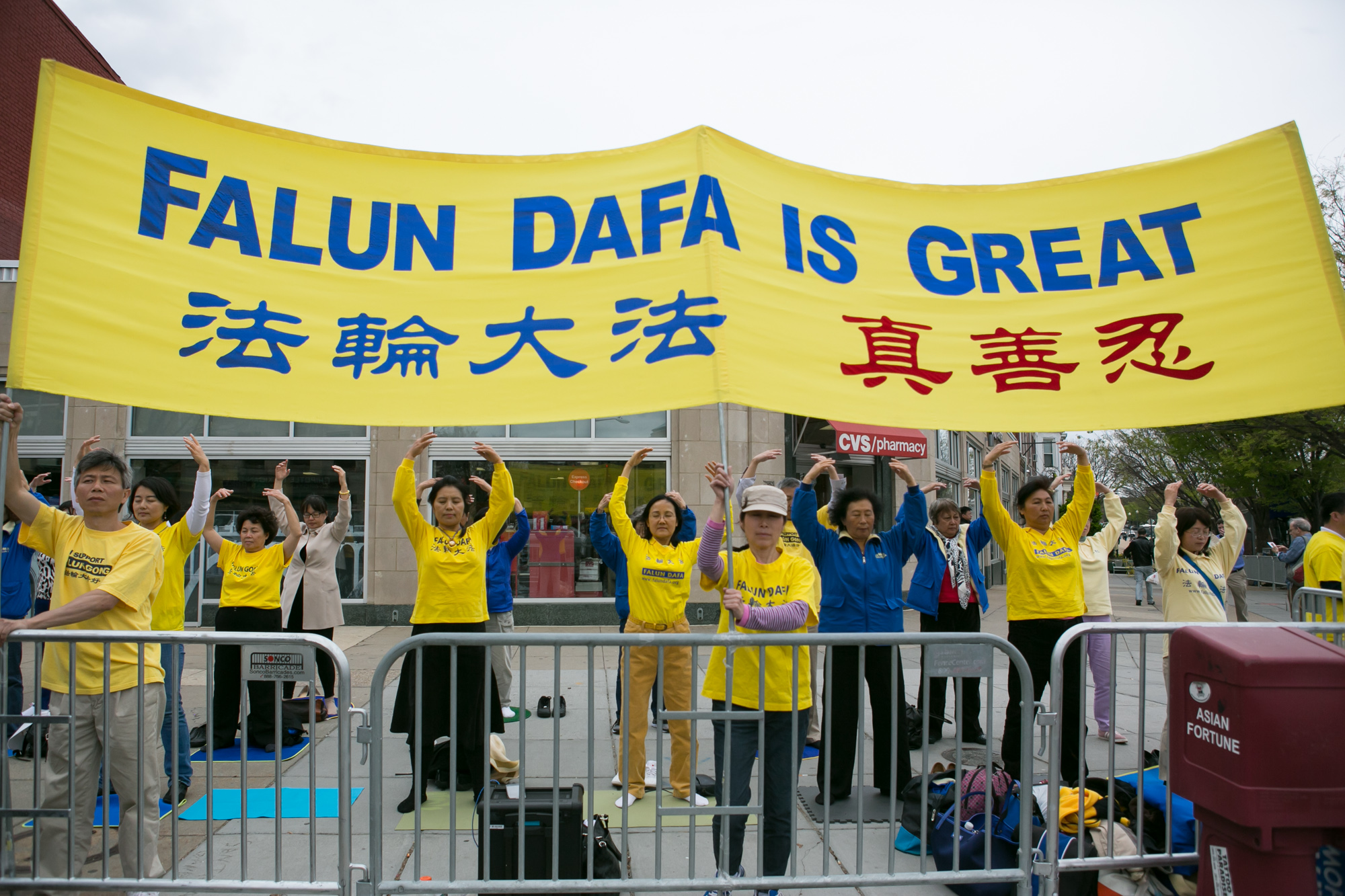 星期四,习近平入住的欧尼肖雷汉姆酒店(Omni Shoreham Hotel)周围的主要街道两旁挤满了人。从早八点至晚八点,华盛顿特区的部份法轮功学员在康涅狄格大道(Connecticut Avenue)两侧人行道上打出“法轮大法好”﹑“法办江泽民”等横幅,并展示法轮功五套功法。宁静﹑祥和的场面吸引很多人驻足观看,不少前来欢迎的人也拿出手机拍照,还有人在一旁学炼法轮功功法。