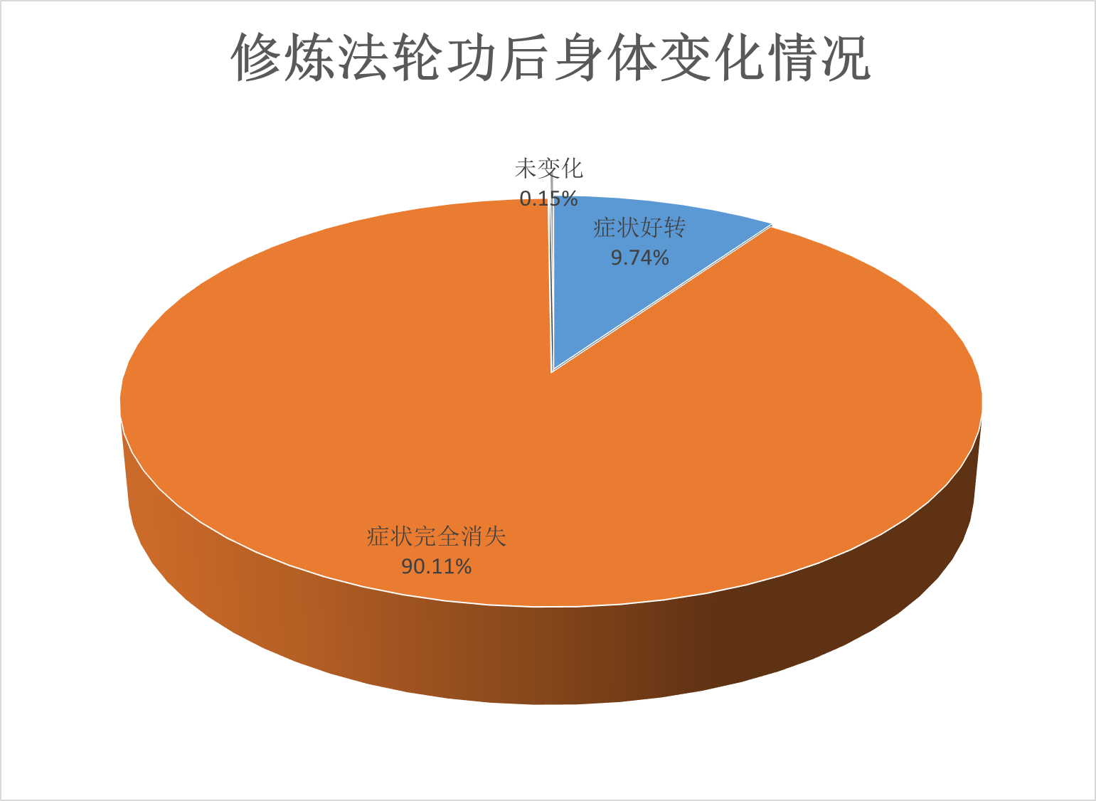 一九九八年二月,大连地区辅导站曾做过一个修炼法轮功健康调查。被调查人数共六千四百七十八人,涉及大连市区二百三十四个炼功点,女性占百分之七十六,平均年龄五十五岁,这个年龄段的人是发病率最高的人群,家庭、工作等各方面压力使很多人患多种病症。他们平均修炼时间不到两年,平均每天炼功两小时。修炼法轮功后,疾病症状完全消失占百分之九十;症状好转,占百分之九点七;总见效率占百分之九十九点八。