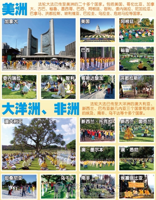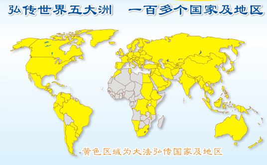 一九九五年初,李洪志先生走出国门,把法轮大法的美好带给全世界向往“真、善、忍”的人们。短短三四年间,法轮功传遍了欧、美、澳、亚四大洲。一九九八年十一月二十四日,上海电视台在报道中讲到:法轮功已传遍欧美澳亚四大洲,在上海及世界其他国家广受欢迎。并称:全世界已有一亿人在炼法轮功。