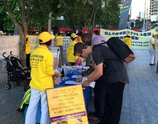 布里斯本广场位于市中心的乔治大街,紧邻布里斯本河,后面是布里斯本广场图书馆,对面是Conrad Treasury Casino赌场,平时有很多市民及来自世界各地的游客。当天是周五,更是人流熙攘。人们纷纷驻足观看真相展板,听法轮功学员讲真相,并在反迫害、反活摘、声援起诉江泽民的征签簿上签名,不少人还拍照留念。