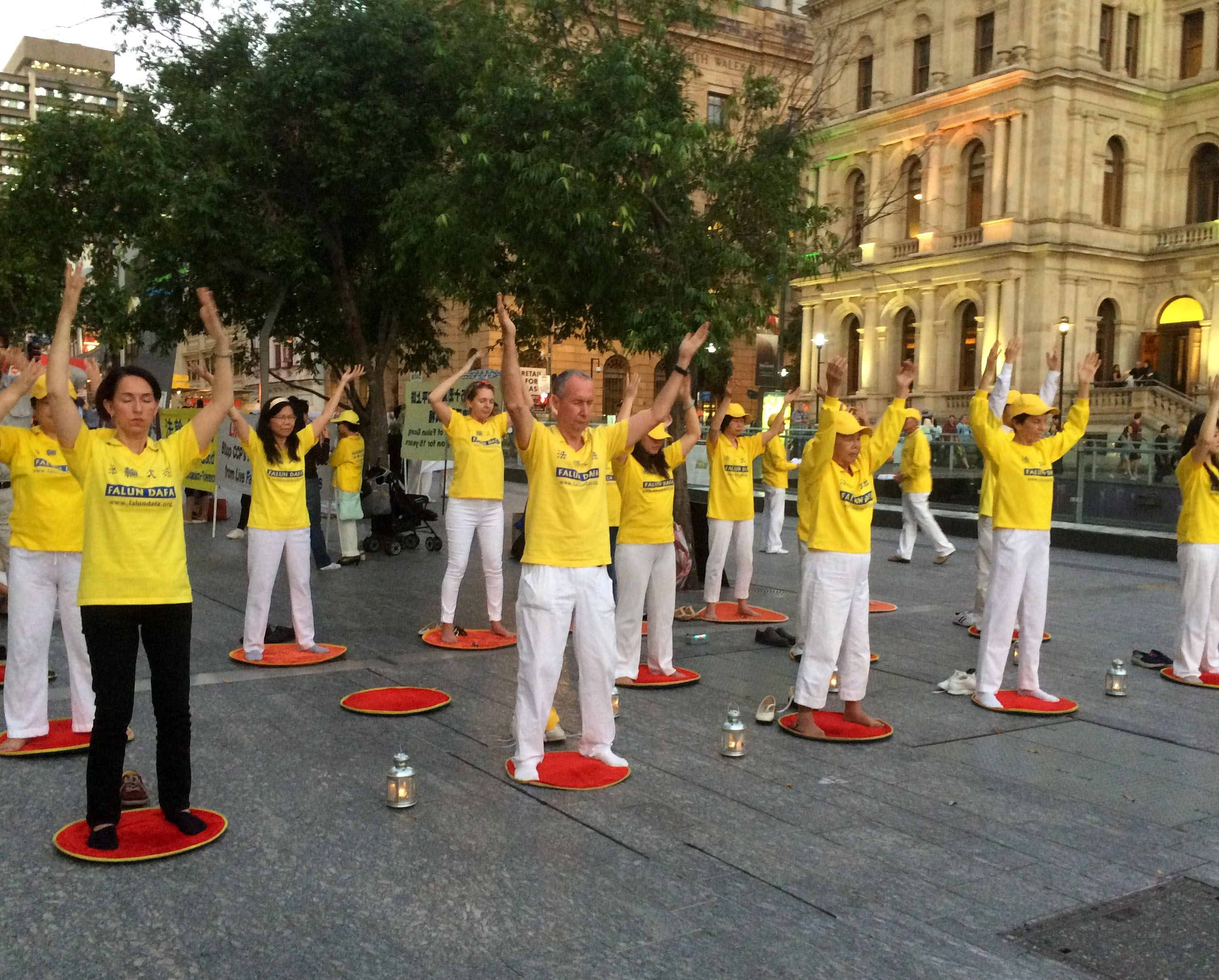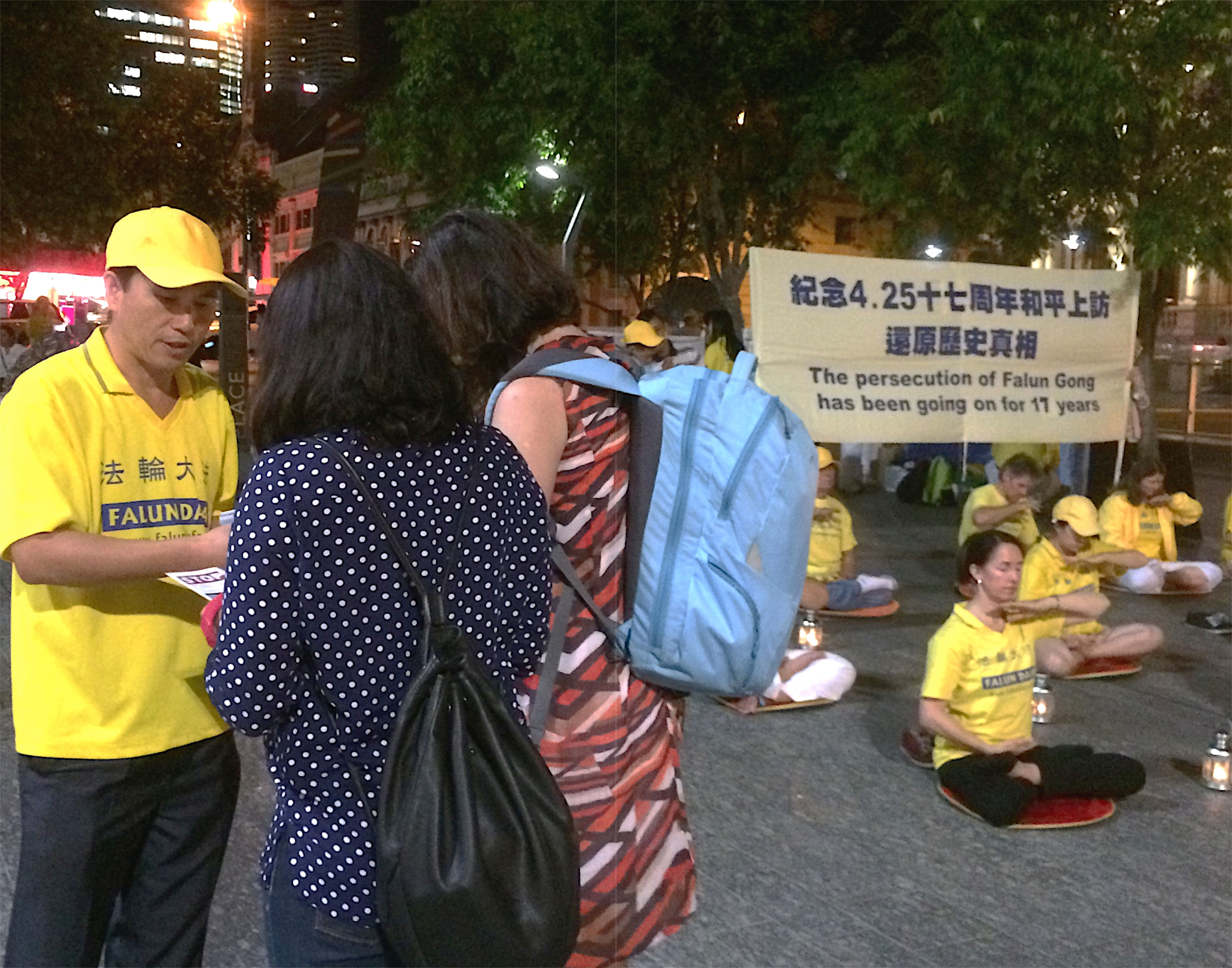 夜幕降临,美丽的布里斯本广场灯光璀璨。法轮功学员点起一支支蜡烛,纪念“四•二五”,悼念被中共迫害致死的同修,提醒世人迫害还在继续,同时呼吁法办迫害元凶江泽民,尽快结束这场惨无人道的邪恶迫害。