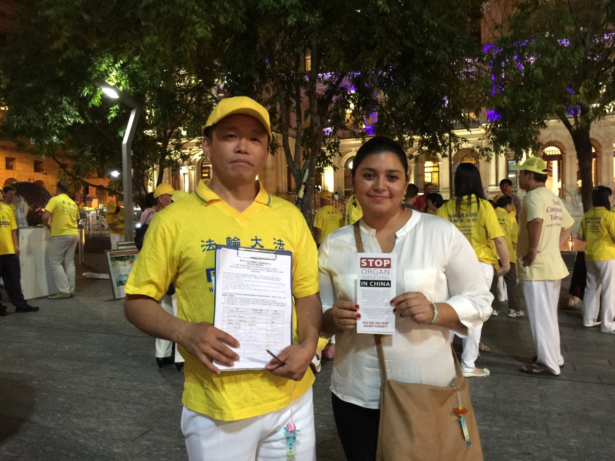薇薇(Vivi)来自哥伦比亚,是Nespresso咖啡连锁店的一名店员。她和法轮功学员谈了一个多小时,拿了很多真相资料,并在征签簿上郑重签名。她说:“应该让更多的人知道这件事(活摘器官),不仅在澳洲,还要在欧洲、亚洲、美洲及全世界曝光中共的罪恶,全世界人民都应该站出来制止迫害!”离开时,她愉快地接受了学员送她的纸折莲花并与学员合影留念。