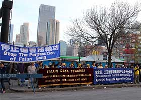 四月二十三日,美国伊利诺伊州的法轮功学员在芝加哥中领馆前举行活动,纪念四二五和平上访十七周年。