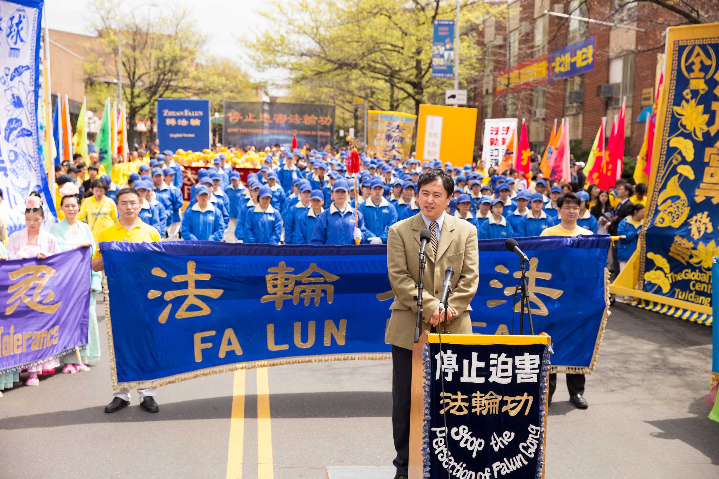 图1:纽约集会赞颂四二五精神,图为法轮大法信息中心发言人张而平先生,他表希望每个中国人都能够站在正义的一边,制止迫害,明白法轮大法好,给自己、也给中国开创美好未来。