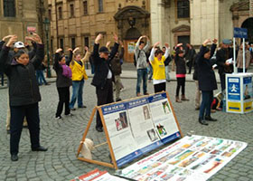 四月二十四日,为纪念四二五法轮功和平上访十七周年,英国法轮功学员在伦敦市中心的鸽子广场举行功法展示和向世人讲真相活动。