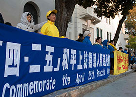 旧金山法轮功学员纪念四二五 守护正义与善良(图)
