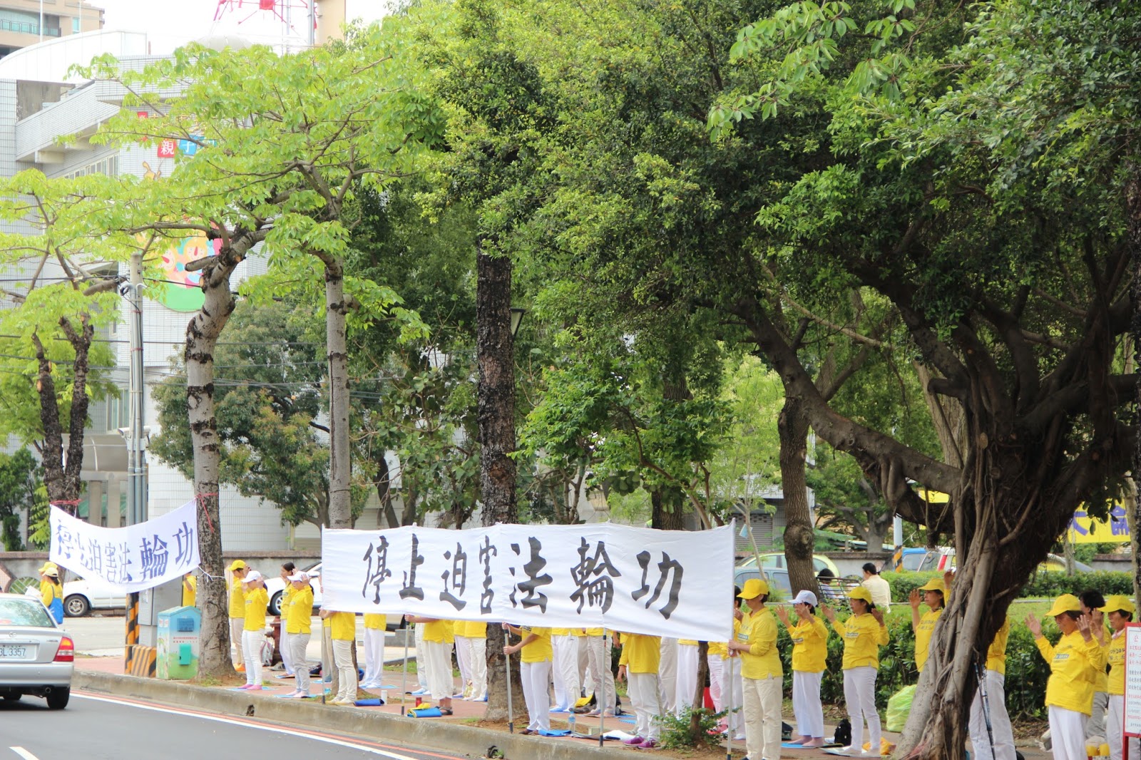 图2-3:下午一点开始,来自台中、彰化、云林、南投的部分法轮功学员,在葫芦墩公园内及两侧的人行步道打出“法轮大法好”、“停止迫害法轮功”的横幅,有的演示法轮功的功法,向过往的人们表达和平反迫害的诉求。