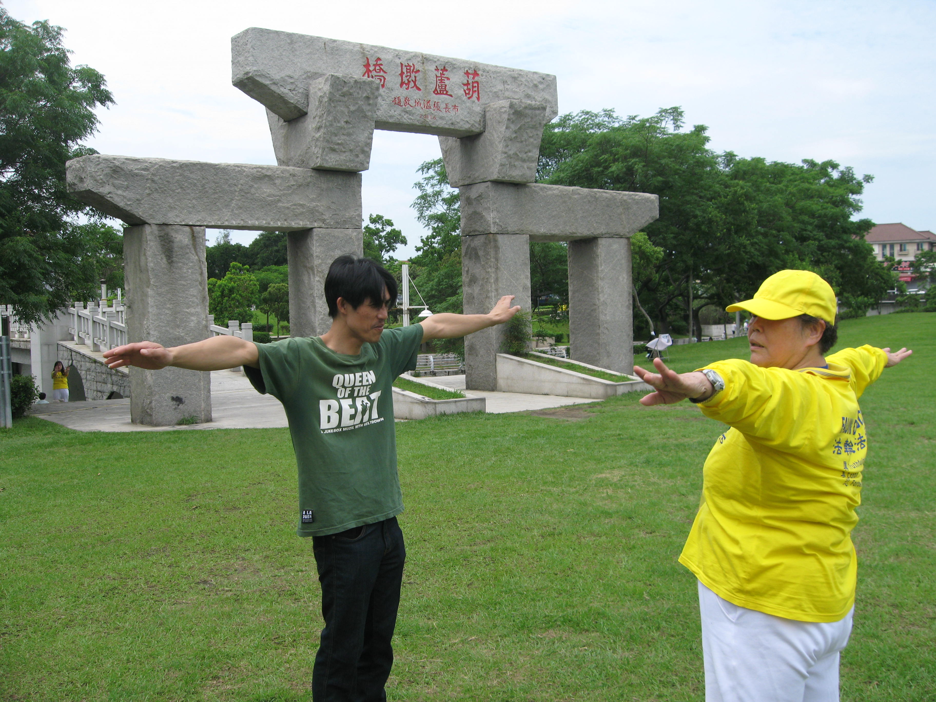 图5:正好经过公园的杨先生看到现场有这么多法轮功学员,很有兴趣的走进了解,经过学员介绍后,他兴起学炼的想法,于是询问起炼功点,并且开始跟学员学炼起来。