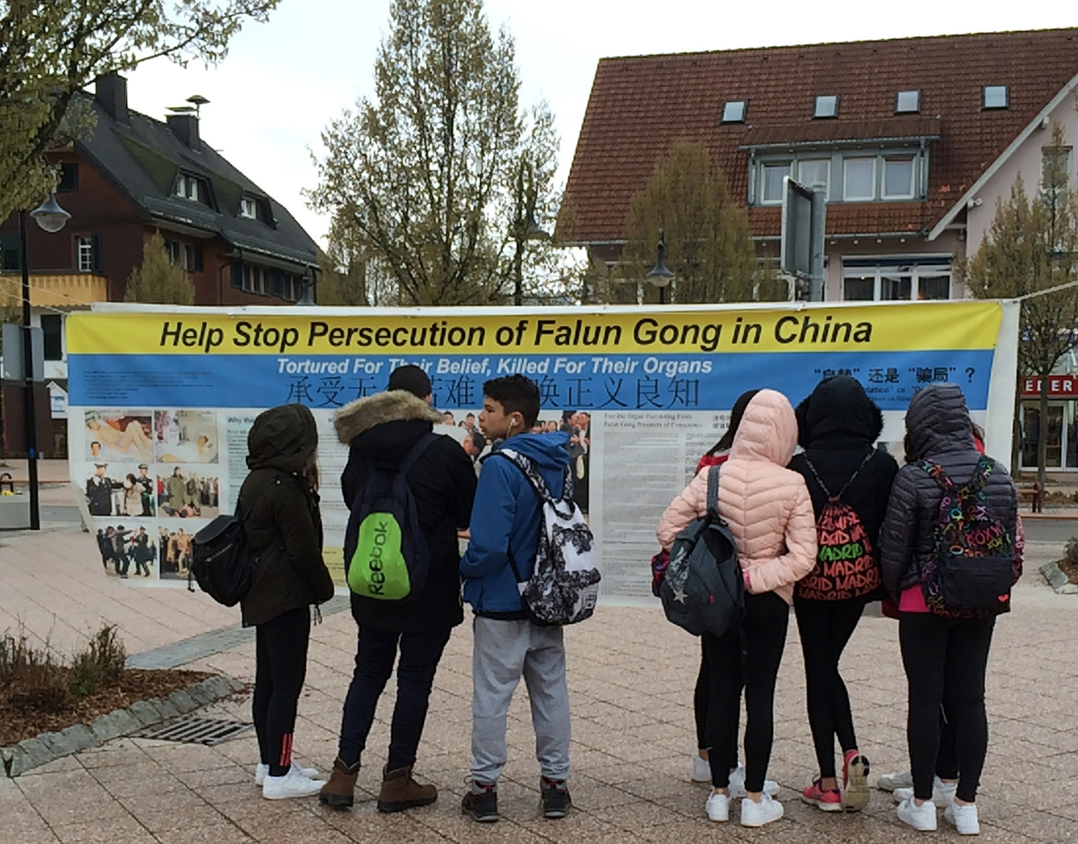 一群来自西班牙的学生被图片上残酷迫害的场面惊呆了,他们围着展板,面带惊愕地一块一块地看着,边看边互相议论。离开前,每个人都恭恭敬敬地接受了一份西班牙文的真相资料。