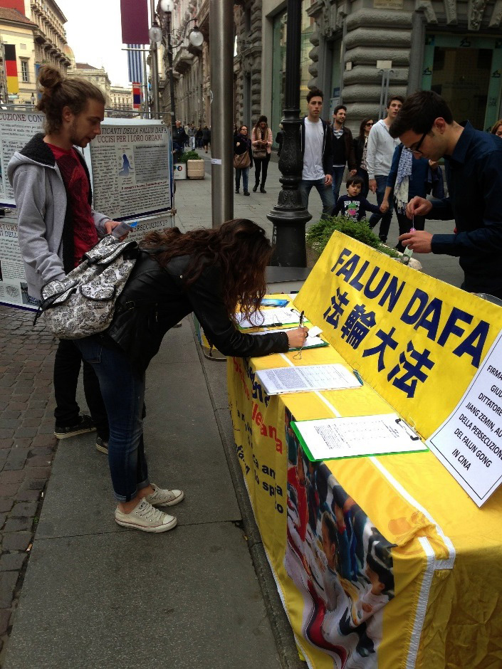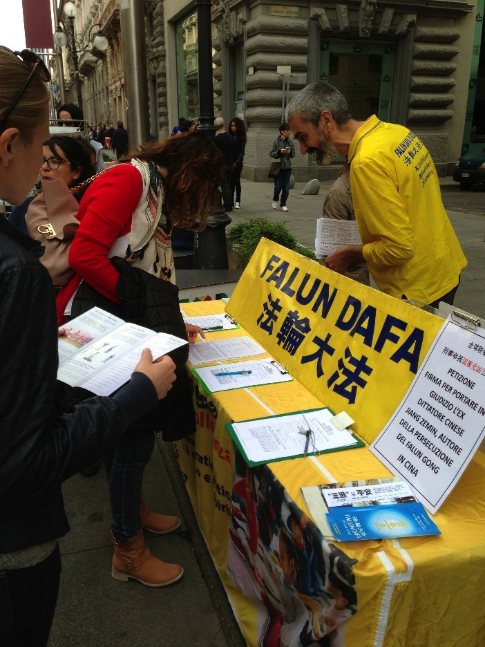 整个活动中,很多意大利民众和其他国家的游客都明白了真相,欣然签名举报迫害元凶江泽民,还有很多人对法轮功功法很感兴趣,询问如何可以学炼。
