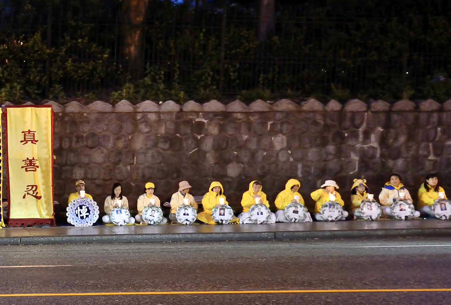 图1-3:二零一六年四月二十三日晚,部分温哥华法轮功学员在中领馆前烛光守夜,纪念四二五十七周年。