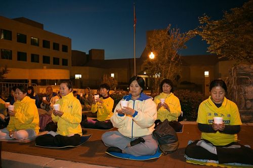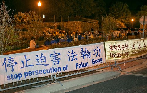 图1-3:纪念四二五,二零一六年四月二十四日傍晚,美国首都华盛顿DC地区的部分法轮功学员在中共大使馆前举行集体炼功和烛光守夜,呼吁制止迫害,法办江泽民。
