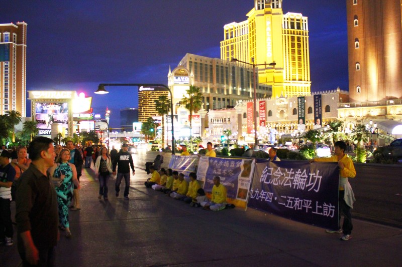 图1-4:二零一六年四月二十四日傍晚,拉斯维加斯法轮功学员在蜃景酒店前举行集会,纪念四二五,呼吁制止迫害。