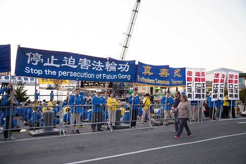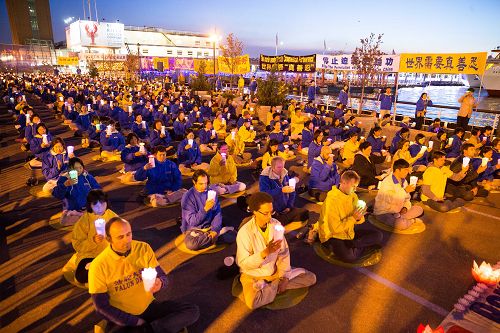 法轮功学员身穿蓝色夹克或黄色T恤,在音乐声中静静地炼功。“法轮大法好”,“真善忍”,“停止迫害法轮功”,“法办江泽民”等横幅环绕在周围。夜幕升起,学员们举起莲花灯烛,场面庄重肃穆。