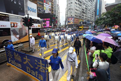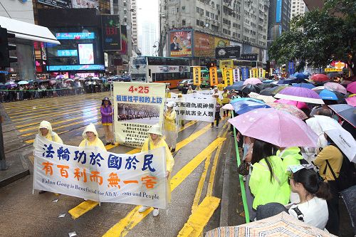 近日来,香港天气阴晴不定,二十四日整天,时而细雨绵绵,时而暂短放晴,旋又雨丝纷飞,有时斜风挟雨扑面,有时倾盆大雨淋下。法轮功学员浩然正气而又祥和理性的游行队伍在风雨中前进,狂风斜雨阻挡不了法轮大法美好的福音,以及人们想要了解真相的渴望。游行沿途吸引大批市民及游客冒雨观看,有的撑伞或头戴便帽站在人行道上频向游行队伍挥手致意,许多游客纷纷用手机、相机拍摄难得的游行画面,有的原本站在骑楼遮雨处,刻意挤到前排冒雨抢拍画面。